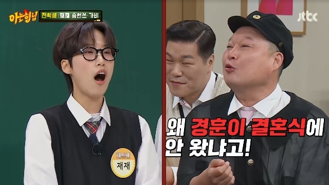 JTBC‘아는형님’캡처JTBC‘아는형님’캡처[뉴스엔서유나기자]PD출신방송인재재가방송인조세호를잇는프로불참러에등극했다.11월30일방송된JTBC예능'아는형님'(이하'아형')461회에서는재쓰비의재재,승헌쓰,가비가형님학교로전학을왔다.이날강호동은민경훈결혼식에대해보도한기사에서본인을웃게한포인트를전했다.그는"비공개라서기사를쓸때짐작을하셨을텐데'연말시상식방불케하는'이라고적으셨더라.사실(연예인은)우리밖에없었거든"이라며웃었다.강호동은이후재재가전학을오자"왜경훈이결혼식안왔냐"고물었다.재재는이에"초대를안했는데어떻게가"라며황당해해웃음을자아냈다.강호동은"그래도와야지"라고우기며재재를놀렸다.한편민경훈은지난11월17일과거'아는형님'의연출을맡았던신기은PD와결혼식을올렸다.뉴스엔서유나stranger77@기사제보및보도자료[email protected]ⓒ뉴스엔.무단전재&재배포금지Copyright©뉴스엔.무단전재및재배포금지.
