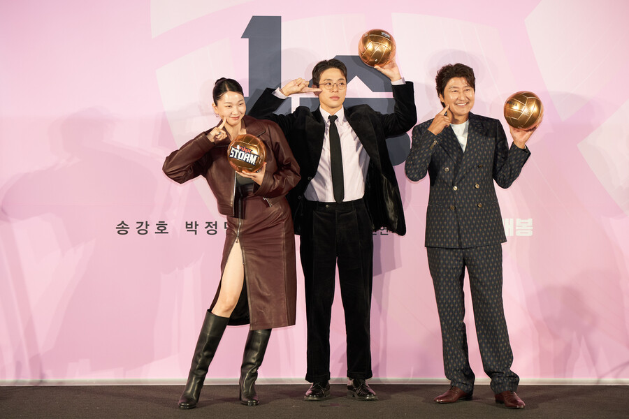 ▲장윤주,박정민,송강호(왼쪽부터).제공|미시간벤처캐피탈㈜[스포티비뉴스=김현록기자]100승같은1승의이야기가펼쳐진다.28일오후서울CGV아이파크몰영화'1승'(감독신연식)의언론배급시사회가열렸다.신연식감독과배우송강호박정민장윤주가참석했다.영화'1승'은이겨본적없는감독과이길생각없는구단주,이기는법모르는선수들까지승리의가능성이1도없는프로여자배구단이1승을위해도전에나서는이야기를그린영화다.국내최초의배구영화로도주목받고있다.송강호는배구인생30년이패배감의연속이었던감독우진역을맡았다.실제로도배구팬으로알려진송강호는"요즘시즌이라매일중계방송을보는편이다.남자배구도매력적인데여자배구만이가지고있는아기자기한지점이너무좋아재미있게보고있다"고말했다.팀워크와소통이그가느끼는배구만의매력.송강호는"1승한다는것이뭔가대단한것은아니지않나.그런데1승자체가100승처럼느껴진다.사실은배구시합에서1승자체가중요한것이아니라그것을통해서잃어버린자신감,세상에서자기도할수있다는희망을가진다면1승을뛰어넘어100승1000승의성취를느낄수있는영화가되지않을까한다"고짚었다.이어"배구라는스포츠가소재지만우리인생나만의1승을위해노력하고투쟁하는영화가되기를바랐다.그래서영화의매력을느끼지않았나한다"고털어놨다.'1승'은사실송강호가'기생충'의영광이후가장처음선택한작품이기도하다.'기생충'이후고민이많았고,무겁지않은산뜻하면서도경쾌한작품을하고싶었다는그는이후시리즈'삼식이삼촌',영화'거미집'을통해신연식감독과연달아작업했다.송강호는"도전에는항상위험이붙어있다.그런것을늘갈구하면서30년동안해왔다"면서"어떤구간에서는뭘해도잘되고뭘해도사랑을받는작품을할때가있었다.인생도배우도마찬가지다.어느구간에서는그런노력들이잘소통이안돼서결과가안좋을수도있다.뭔가가문제라기보다는그런것에서자유로워져야하는것이아닌가.배우를떠나예술가들이가져야하는기본적인자세라고생각하고늘노력했던것같다"고언급하기도했다.▲송강호.제공|미시간벤처캐피탈㈜박정민은황당한공약을남발하는재벌출신괴짜구단주로분해독특한매력을발산했다.박정민은"어려서부터이기고지는데굉장히연연하면서살았다.그래서습관처럼남아있다.이긴순간보다진순간이압도적으로많았던것같다.대부분우리모두가그럴것같다"면서"그런사람들에게이영화가응원이될수있을거라는생각을했다"고작품을선택한이유를밝혔다.또"사실송강호선배님이랑같이하고싶었다.같이현장에있으면어떤느낌일까궁금했다.시나리오와선배님이이영화에출연하는데중요한요소였다"고말했다.이어박정민은"네가뭐라고이런말을들을까봐한적은없었다.처음이직업을한다고했을때송강호선배님처럼되고싶었다.원대한꿈이다"라고털어놨다.박정민은"그러고십몇년이지나선배님을현장에서뵈었을때모든부분이신기하고모든것을배웠고많은것들을제수첩에적어놨다"면서"그런것들,그런순간들이제게는배움이었다.아마굉장히오랫동안제마음속에남아있을것같다.너무행복한기억이었다"고말했다.이를듣던송강호는"참고로이말씀은진심이다.이자리에서만하는이야기가아니라몇년전부터박정민씨가이이야기를자주했다.제가그걸봤다.거짓말은아닌것같다"고너스레를떨기도했다.독특한패션과라이브방송등으로'관종'재벌구단주를표현해낸박정민은"있어보여야하니가.저를쌩으로드러내면있어보이지않으니까.안경이나모자옷앞머리등을했다.캐릭터에맞게옷을입어야하는데,굉장히여러벌을입어봤다.저와잘붙는옷을고르느라고반복해서입었다.전에보지못했던구단주,재벌느낌을주고싶었다"고덧붙였다.장윤주는"'핑크스톰'주장방수지역장윤주다.방금영화를봤는데되게유쾌하고통쾌하고즐겁게끝이났는데가슴에감동이있었다.여러분도그러셨죠"라고인사했다.▲영화'1승'스틸.제공|미시간벤처캐피탈장윤주는"제가맡았던배역이점프를많이해야하는포지션이다보니까무릎이실제로부상이있었다.고생을하면서촬영했다"고털어놨다.그는"저는그래서그랬는지,부상이아니었어도강스파이크를너무해보고싶었다.하지는못했다"면서"배움의시간도짧았고그런체력이있지도않았다.저스파이크를내가한번하고이영화를끝냈어야하는데하는아쉬움이있더라.스파이크가그만큼멋진한방인것같다"고털어놨다.이가운데신연식감독은장윤주를두고방수지캐릭터를썼다며그사연을공개하기도했다.신감독은"장윤주배우를오래알았다.모델후배들에게독특하고매력적인리더십을보일때.잔소리를하지않고그대로품어주는리더십이랄까.핑크스톰이라는팀의장점이그것이라고생각한다"고말했다.이어"단장실에서불을냈다고하니까담배를끊으라고하는게아니라전자담배를주자고한다.모두가단점이있는데단점을그대로받아들이고장점이살아나는것이핑크스톰"이라며"기능적으로중요한,상직적인롤로서방수지역을생각했다.그부분에서장윤주배우에게전적으로많은도움을받았다"고덧붙였다.▲영화'1승'스틸.제공|미시간벤처캐피탈한국첫배구영화를만들면서전설같은이들의도움을많이받았다는신연식감독은