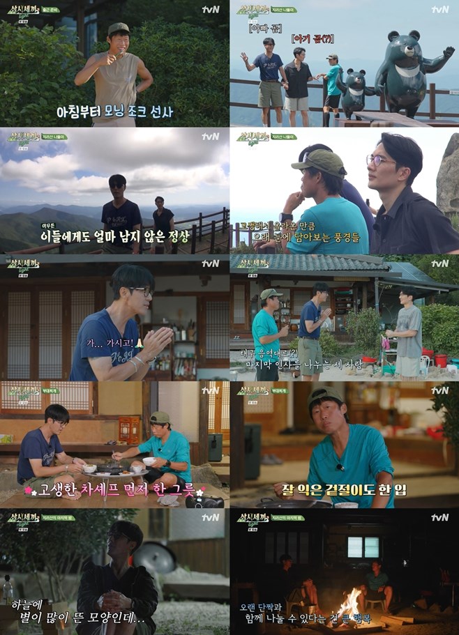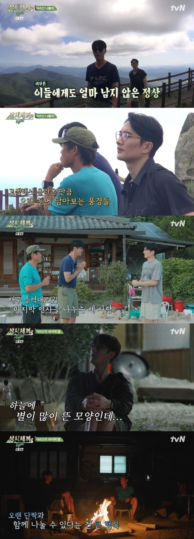 '삼시세끼Light'/tvN영상캡처[마이데일리=이승길기자]차승원과유해진이지리산에서의마지막밤을낭만으로가득채웠다.15일방송된tvN‘삼시세끼Light’에서는차승원과유해진이지리산세끼하우스의일상을아름다운별빛으로매듭지으며시청자들의감성을자극했다.이날차승원과유해진은막내엄태구를위해아침부터흡사도련님생일상(?)을연상케하는진수성찬을차렸다.달걀찜과콩나물국,볶음김치와바삭한조기구이등풍성한식탁은보는이들마저군침흘리게했다.밥도둑반찬들과함께든든히배를채운이들은세끼하우스근처에있는지리산으로향했다.따듯한햇살과시원한바람에한껏기분이좋아진차승원은유해진,엄태구와함께과감히등산길에올랐다.끝이보이지않는돌계단을꾸준히오르는동안세사람은함께사진도찍고대화도나누며뜻깊은추억을쌓았다.무거운장비를찬제작진을도와걷고뛰고를반복하던세사람은어느덧지리산노고단정상에도착했다.등산의피로를싹씻어주는노고단의푸른풍경은반등산파(?)로소문난차승원마저“올라오길잘한것같다”고감탄하게만들었다.특히지리산등반을하는동안‘삼시세끼Light’에100%적응한엄태구의솔직한고백이눈길을끌었다.수줍음이많은자신의성격에대해“자괴감이많았었다”고밝힌엄태구는“근데그모습을좋아해주시는게너무신기했다”며소회를전했다.이에차승원은“그런것들이너무좋다”며“변하지마라”고다정한응원을건네뭉클함을안겼다.막내엄태구와진한포옹으로아쉬운이별인사를나눈차승원과유해진은쉴틈도없이곧바로저녁준비에돌입했다.정성스럽게고아낸사골육수로부대찌개를끓이고먼저만들어둔밑반찬까지꺼내완성한저녁상은먹음직스러운자태를뽐냈다.두사람은편안한친구와맛있는음식을먹으며다사다난했던하루를회상했다.여기에별들로빼곡하게채워진지리산의밤하늘이세끼하우스의낭만적인분위기를배가시켰다.가만히별을바라보던차승원과유해진도“이런거다추억이야”라며사진으로매순간을기록해훈훈함을자아냈다.Copyright©마이데일리.무단전재및재배포금지.