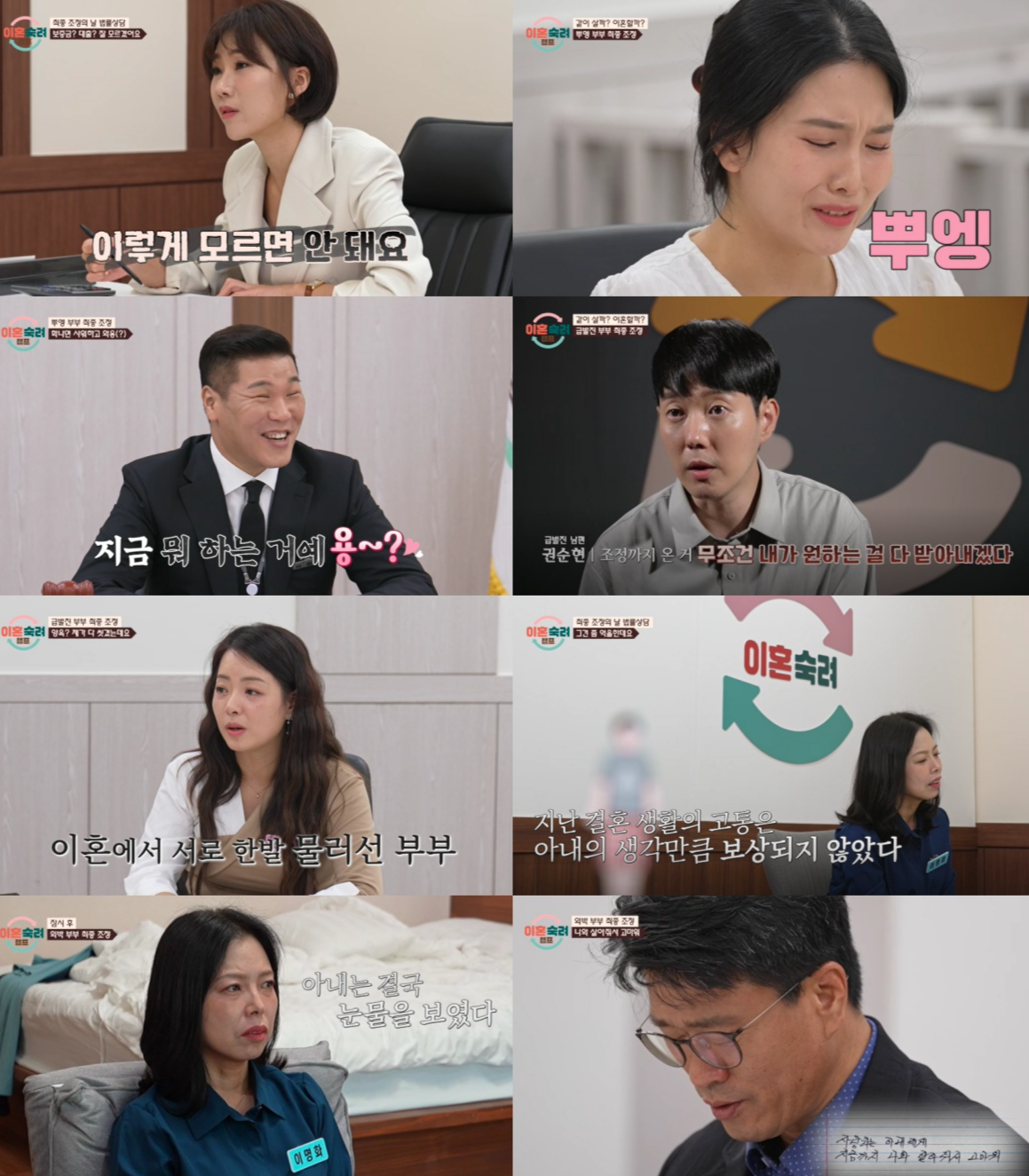 5기부부들의최종조정결과가공개됐다.지난14일(목)방송된JTBC'이혼숙려캠프'에서는반전과감동이가득한5기부부들의변호사상담과최종조정결과가공개됐다.먼저'뿌엥부부'의아내는상담중재산현황에대해잘모르겠다고만답하며양나래변호사를당황에빠트렸다.난감해하던양나래변호사는가계경제에무지한아내에게결국"이렇게모르면안된다"며아내의앞날을위해따끔하게조언했다.또한,아내는부부가모두양육권을원하는상황에놓이자결국조정장에서눈물을참지못하고모두를당황하게했다.이에MC서장훈은"오래참았어"라며해탈모드를보여웃음을자아냈다고.이같은조정과정을통해남편은명령조어투를깊이반성하고,아내는남편의말을진지하게경청하고대화하기로약속하며결혼생활을이어가기로결정했다.남편의음주와외박문제로갈등을겪던'외박부부'는위자료와재산분할에대한변호사상담을진행했다.아내는남편의음주문제에대한최대예상위자료가3천만원밖에안된다는사실뿐만아니라,소득과퇴직금도남편보다높아자신이큰손해를본다는사실을알게됐다.특히아내는변호사상담후에도여전히안일한태도를보이는남편에게또한번실망하고손해를보더라도이혼하겠다며눈물을보이기도했다.이들은조정이시작되고재산을5대5로나누고퇴직금은각자에게귀속하는것으로원만하게합의를마쳤는데,조정마지막단계에서이혼을원하지않는남편이지난날을반성하며아내에대한마음을담아쓴편지를읽어내려갔다.이에감동받은아내는그동안의서운했던감정을풀고다시잘살아보자며마음을열어훈훈함을자아냈다.마지막으로'급발진부부'의최종조정도진행됐다.남편은"조정까지왔으니무조건내가원하는걸다받아내겠다"며양육권과양육비는물론7대3의재산분할을요구했다.재산대부분이본인명의임에도같이일궈온남편의노고를인정해재산의절반을나눠주겠다고했던아내는남편에게큰배신감을느껴재산과양육권을두고치열한공방전을이어갔다.하지만이들은치열한공방전끝에아내의건강상태와남편의급발진하는성격을서로인정하고요구사항을조정했다.남편은아내에게급발진하지않고공감하는말투를사용하는것과3개월간아내의식단을통제하지않기로약속했고,아내는혈당수치가나빠지면남편의식단에불만없이따르기로하며원만한합의를마쳤다.한편,지금까지의모든출연자들을뛰어넘는6기부부들의충격적인사연공개를앞둔JTBC'이혼숙려캠프'는11월21일부터매주목요일밤10시10분에방송된다.Copyright©JTBC.무단전재및재배포금지.