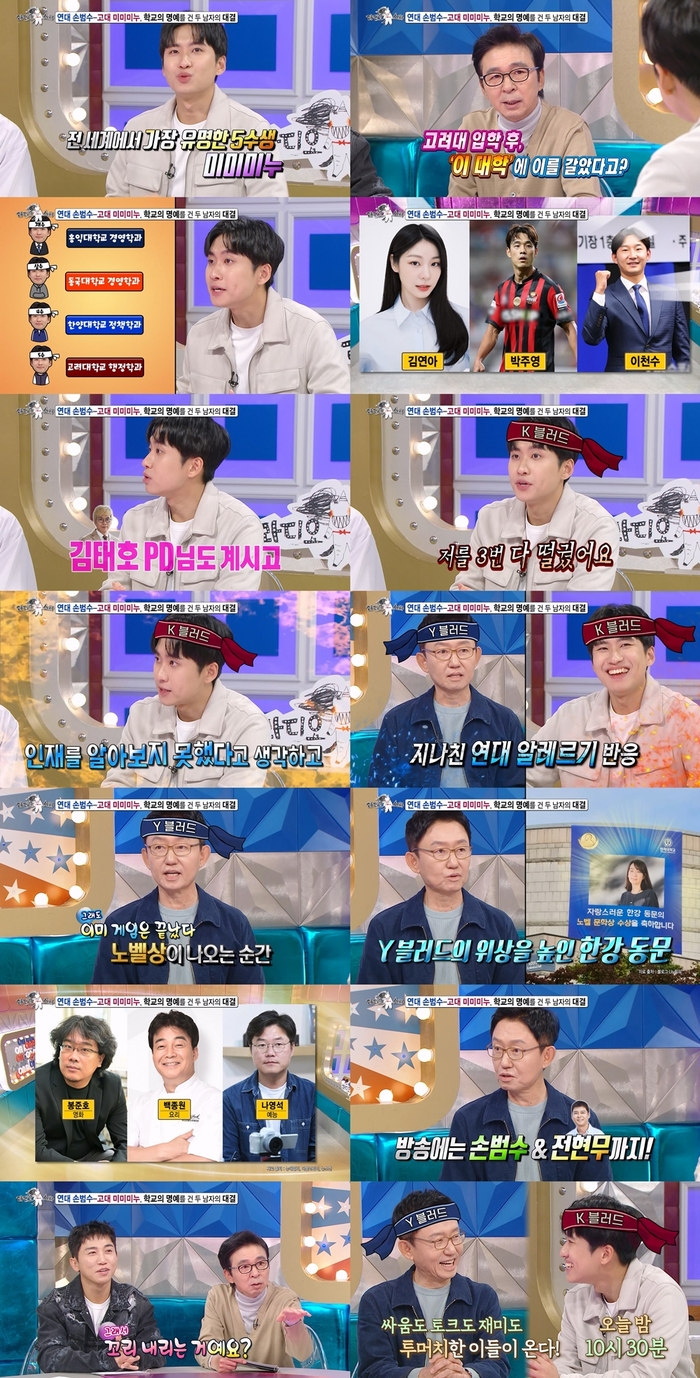 ‘라디오스타’.사진|MBC연세대출신손범수와고려대출신미미미누가학교의명예를건자부심대결을펼친다.13일오후10시30분방송되는MBC예능프로그램‘라디오스타’는손범수,한상보,뉴진스님,미미미누가출연하는‘투머치가온다’특집으로꾸며진다.방송에앞서공개된선공개영상에는가장유명한‘5수생’미미미누가남다른모교자랑을펼치는모습이담겨있다.5수끝에고려대에입학한미미미누는“고려대의자랑이라고하면많은정치인분들이배출됐고,스포츠에는김연아선수도있고이천수,박주영선수도있고,김태호PD님도계시고”라며자부심을드러낸다.또한그는“연세대를배척(?)하고있다”라며“제가논술시험을세번이나봤는데저를다떨어뜨렸다.교수님들이인재를알아보지못했다고생각한다“라고분노를터트리기도.또그는학교이름을붙인우유,빵까지언급하며“이런행태가참으로마음에안든다“라고거침없는‘K블러드’의입담을뽐낸다.이를듣고있던연세대출신손범수가반격에나선다.그는“대개연세대합격을못한사람들의후유증이상당히크다”라며‘지나친연대알레르기반응’이라고정의해웃음을자아낸다.심지어”고대생들은약국에가도‘연고’달라고안하고‘고연’달라고한다“라고말해모두를빵터지게만들었다는후문게다가손범수는”이미게임은끝났다“라며최근노벨문학상을수상한연세대출신한강작가를언급한것에이어”영화에는봉준호,요리하면백종원,예능에는나영석PD,방송에는손범수,전현무까지”라고‘Y블러드’의자부심을자랑한다.MC김국진은조용해진미미미누를향해“꼬리내리는거예요?”라고물었는데,미미미누는본인의밈유행어인“넘어갈게요”라고받아치며다급히토크를패스해폭소를유발한다.손범수와미미미누의치열한모교자랑타임은13일오후10시30분에방송되는‘라디오스타’의‘투머치가온다‘특집에서확인할수있다.[김소연스타투데이기자]Copyright©스타투데이.무단전재,재배포및AI학습이용금지