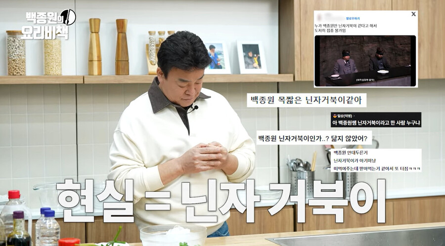 ▲백종원.출처ㅣ백종원유튜브▲백종원.출처ㅣ백종원유튜브▲백종원.출처ㅣ백종원유튜브▲백종원.출처ㅣ백종원유튜브[스포티비뉴스=강효진기자]백종원이'흑백요리사'속'바스먹는짤'비하인드를전했다.8일유튜브채널‘백종원’에선‘나이불킥하게만든정지선씨,이리와봐유!’라는제목의영상이업로드됐다.이날백종원은'흑백요리사'에함께한정지선셰프를소개하며"흑백요리사심사하면서이양반때문에굉장히당혹스러웠고이상한짤이돌았다"라며'흑백요리사'당시입을가리고바스를먹던영상을언급했다.백종원은"다른분들도좋아하고심지어우리딸들도좋아하긴하지만저한테는치욕적인짤이었다.이게멋있게보일줄알았는데안멋있더라.그상황에서우리어렸을때보던쾌걸조로라고있었는데그렇게멋있게보일줄알았는데"라며조로대신닌자거북이로불리는현실을안타까워해웃음을자아냈다.▲백종원.출처ㅣ넷플릭스영상캡처백종원은"저번에바스를했지않나.나를굉장히난처하게했던바스"라고언급했고,정지선은"그게그렇게이슈가될거라고는생각하지못했다"고답했다.이와함께백종원은"중국에이런바쓰라는음식이있다고알려준건데약간이번에오해도있었지않나?"라고물었고,정지선은"맞다.저는중국요리를알리겠다고자부심갖고열심히하는데‘중국요리인데한국요리로탈바꿈할거지’라고하더라"라고가짜뉴스때문에억울했던마음을전했다.<저작권자ⓒSPOTVNEWS.무단전재및재배포금지>Copyright©스포티비뉴스.무단전재및재배포금지.