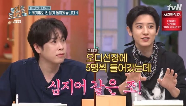 tvN‘놀라운토요일’tvN‘놀라운토요일’[뉴스엔유경상기자]찬열과피오가과거인연을공개했다.1월24일방송된tvN‘놀라운토요일’에서는엑소수호,찬열이출연했다.찬열은피오와학창시절에연기학원을같이다녔다며“중학교3학년때SM들어오기전이었다.피오와같은날연기학원오디션을봤다.같은조로오디션을보러들어갔다.피오가박수를치면서‘피구왕통키’노래를불렀다.동그란안경쓰고”라고말했다.찬열은“같이합격하고6개월넘게같이수업을들었다”고말했고,피오는“행보가달랐다.여의도M연기학원을들어갔는데형은잘생겨서교복콘테스트되고SM발탁됐는데저는그냥고등학교입학했다.교복사러가면형사진이있었다.신기하다,옆에서잘되는과정을봤다”고추억을꺼냈다.하지만피오가블락비로먼저데뷔했고,찬열은“(피오가)먼저데뷔하고저는연습생이었다.제가데뷔하고처음만난게시상식에서신인상을받는데지훈이가반짝이는눈으로쳐다보고있어서마음이좋았다”고말했다.(사진=tvN‘놀라운토요일’캡처)뉴스엔유경상yooks@기사제보및보도자료[email protected]ⓒ뉴스엔.무단전재&재배포금지Copyright©뉴스엔.무단전재및재배포금지.