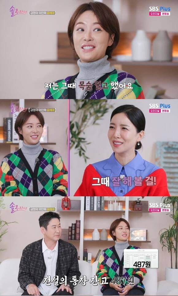 윤세아,황정음향해"'우결'선배님"배우황정음(맨위)이SBSPlus·E채널예능프로그램'솔로라서'에서과거MBC예능'우리결혼했어요'에출연한이유를밝혔다./SBSPlus·E채널[더팩트ㅣ문화영기자]배우황정음이과거연애리얼리티프로그램에진심을다한이유를밝혔다.황정음은5일방송된SBSPlus·E채널예능프로그램'솔로라서'에서과거MBC예능'우리결혼했어요'(이하'우결')출연당시를회상했다.그는"그때목숨걸고했다"고말했다.이날게스트로출연한윤세아는스튜디오에나오자마자황정음을향해"우결선배님"이라고인사했다.두사람은과거'우결'에출연한연인이있다.당시윤세아는줄리엔강과황정음은김용준과함께한바있다.윤세아가"파릇파릇하고너무좋을때아니었나싶다"고말하자황정음은"그때목숨걸고했다.통장잔고가487원밖에없었다"고고백하며"그거타고지금까지온것"이라며답했다.황정음은2009년9년간공개열애한전남자친구SG워너비김용준과'우결'에출연한바있다.이후시트콤'지붕뚫고하이킥'으로일약스타덤에올랐으며드라마'비밀''킬미,힐미''돈의화신''그녀는예뻤다''운빨로맨스''훈남정음''쌍갑포차'등에서열연했다.이후황정음과김용준은2015년결별했다.황정음은같은해프로골퍼겸사업가이영돈과열애를인정,1년만에결혼에골인했지만지난2월이혼했다.'솔로라서'는솔로라서외롭지만솔로라서행복한,매력만점솔로들의진솔한일상을담은관찰리얼리티예능프로그램이다.신동엽과황정음이MC로출연하고대한민국'솔로대표'명세빈윤세아채림사강오정연이솔로라이프를공개한다.매주화요일저녁8시40분에방송되고있다[email protected][연예부|[email protected]]발로뛰는더팩트는24시간여러분의제보를기다립니다.▶카카오톡:'더팩트제보'검색▶이메일:[email protected]▶뉴스홈페이지:http://talk.tf.co.kr/bbs/report/writeCopyright©더팩트.무단전재및재배포금지.