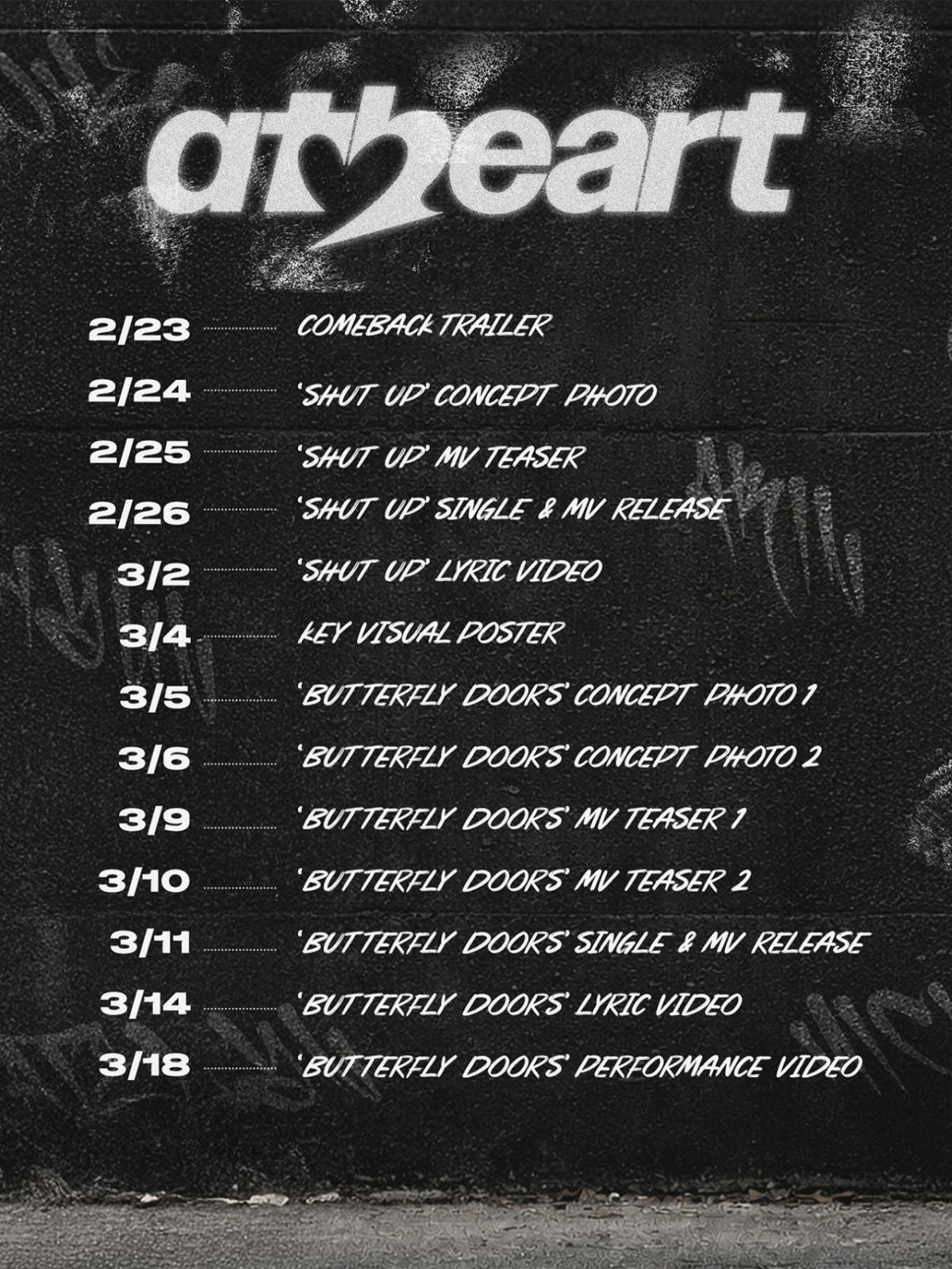 [스타뉴스|문완식기자]/사진제공=타이탄콘텐츠그룹앳하트(AtHeart·미치,아린,케이틀린,봄,서현,아우로라,나현)가컴백스케줄러를깜짝공개,기대감을높였다.앳하트는지난22일공식SNS를통해컴백스케줄러를게재했다.이에따르면,앳하트는오는2월26일오후6시디지털싱글'ShutUp'을,3월11일오후6시또다른디지털싱글'ButterflyDoors'를잇달아발매하며컴백열기를이어간다.특히,앳하트는오늘(23일)컴백트레일러를시작으로각싱글발매일에따라콘셉트포토,뮤직비디오티저,리릭비디오등을순차적으로공개하며국내외팬들과만난다.촘촘한일정속에앳하트가보여줄확장된아이덴티티와비주얼,앳하트만의음악세계에대한궁금증이고조된다.앳하트는두개의싱글을통해각각상반된콘셉트를그려낼전망이다.유기적인서사의흐름위에앳하트는자신들만의색깔을더욱공고히할압도적인음악과비주얼로다시한번전세계에반전매력을전할것으로기대된다.'ShutUp'이앳하트의변화를알리는곡이라면,'ButterflyDoors'는앳하트의정체성과방향성을집약한곡이다.이를위해앳하트는미국올로케이션촬영과글로벌크리에이터들과협업해기존과또다른새로운컨셉과독특한매력을예고,새로운챕터의시작을힘차게전개해나갈예정이다.한편음악,비주얼,콘셉트등전방위적진화에나선앳하트는2월26일오후6시디지털싱글'ShutUp'과3월11일오후6시디지털싱글'ButterflyDoors'를전세계음악플랫폼을통해차례로발매한다.문완식기자[email protected]©스타뉴스&starnewskorea.com,무단전재및재배포금지