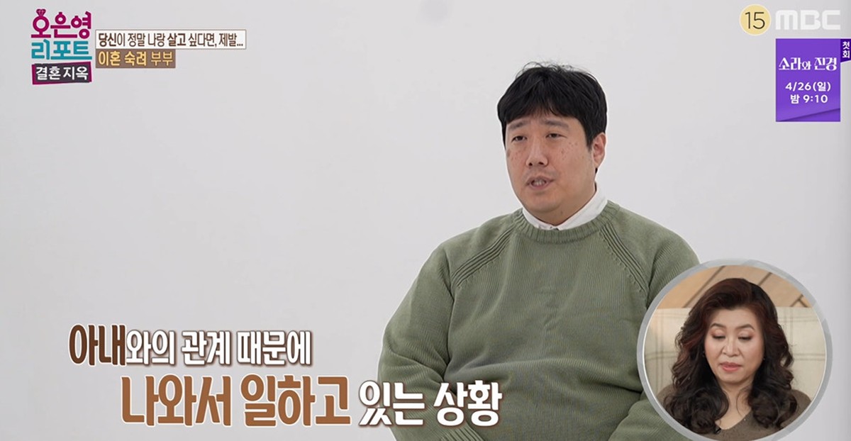 MBC‘오은영리포트-결혼지옥’캡쳐(엑스포츠뉴스정연주기자)'이혼숙려부부'남편이카페에서재택을하는모습이공개돼스튜디오가충격에빠졌다.20일방송된MBC‘오은영리포트-결혼지옥’(이하‘결혼지옥’)164회에서는이혼의기로에선‘이혼숙려부부’의이야기가공개됐다.'이혼숙려부부'는이혼숙려기간중마지막기회라는마음으로오은영박사를찾았다.MBC‘오은영리포트-결혼지옥’캡쳐남편은통으로된아이스크림을한번에다먹는가하면,김밥을80개나먹는다는농담을할정도로식사량이많은남편에아내는한숨을내쉬었다.아내는"남편과현재이혼숙려기간이다.올해1월중순이혼서류를제출했고,관찰촬영후에이혼하고싶은마음이더커졌다"고밝혔다.이후공개된일상은충격적이었다.두부부는각방을쓰면서대화를하지않고전화로소통했고,이들은눈맞춤조차하지않았다.출근한남편은차안에서햄버거로식사를때웠고,카페에도착한남편은노트북으로업무를시작했다.하지만남편은재택이었고,집이아닌카페에서재택업무를하는남편의모습에스튜디오는충격에빠졌다.남편은"아내가집에서일을하면불편해해서카페에서재택을하고있다"고말했고,아내는"내가나가서일을하라고했다.집에서가만히일을하고있으면너무짜증나서내가나가라고했다"고말해다시스튜디오는충격에빠졌다.사진=MBC방송화면정연주기자[email protected]©엑스포츠뉴스.무단전재및재배포금지.