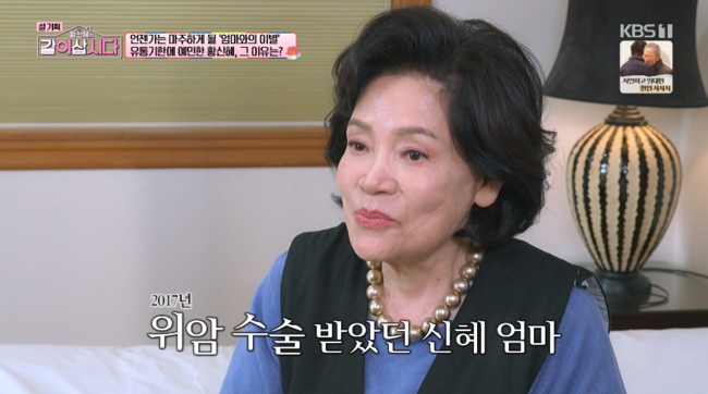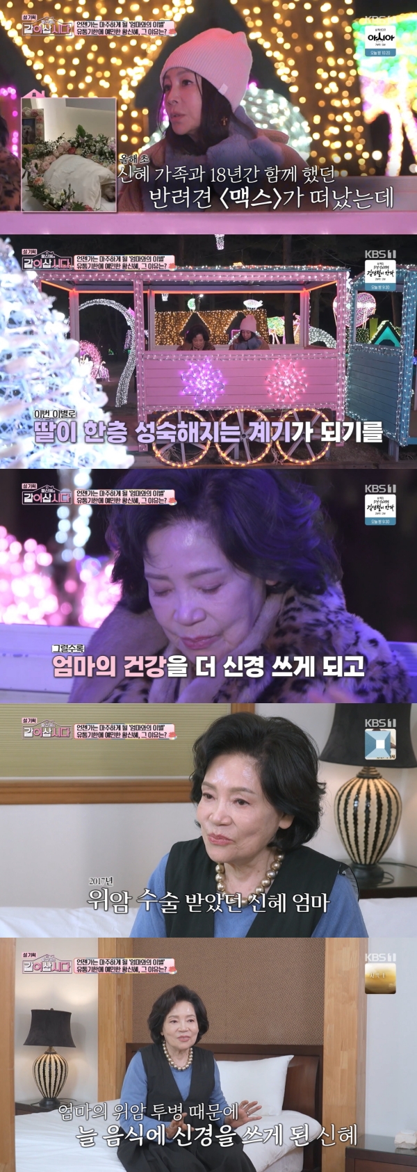 사진=KBS1[스포츠투데이김태형기자]황신혜가어머니의건강을걱정했다.18일방송된KBS1'황신혜의같이삽시다'에는황신혜,장윤정,정가은이어머니들과함께출연한모습이그려졌다.이날황신혜는"올해들어서얼마안됐는데우리가이별을좀했다"며18년간함께했던반려견맥스가떠났다고밝혔다.어머니는"진이속마음이어떻겠냐"며손녀딸을걱정했다.황신혜는"이걸로진이가인생의큰걸배우고성숙해지는계기다.견뎌내고나아가는게인생이다"라고말했다.그러면서"나는이번에맥스보면서'엄마와의이별도겪을텐데'이런생각이들면서진이랑이야기많이했다"고털어놨다.황신혜는"주변에엄마와이별한친구들이몇년이지나도힘들어하는걸보면사실무섭다.엄마가오래있고싶으면유통기한잘챙겨야한다"고전했다.이에대해그는"엄마와제일많이이야기했던게유통기한이다.엄마한테제일많이화내는게그거다"라며유통기한지난음식을버리지않고먹는어머니를걱정했다.어머니는유통기한지난음식을먹었다가배탈이났었다고고백했다.황신혜어머니는"제가2017년도에위암수술을했다"며"이제는유통기한을꼭지키고제몸을사랑하려고한다"고밝혔다.[스포츠투데이김태형기자[email protected]]Copyright©스포츠투데이.무단전재및재배포금지.