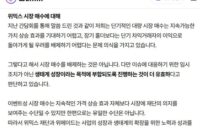 30일위믹스공식커뮤니티공지현재진행중인2000만개바이백과는별도로추진(위믹스공식커뮤니티갈무리)2025.7.1/뉴스1(서울=뉴스1)김민재기자=위메이드(112040)의블록체인전문자회사위믹스재단이투자자들이요구한5000만개이상의위믹스코인바이백(시장매수)요청을사실상거절했다.이는국내주요거래소에서의재상장폐지와는별개로해외시장에서블록체인게임생태계를확장하겠다는의지로풀이된다.1일게임업계에따르면위믹스측은지난달30일공식커뮤니티를통해이같은대규모바이백요구를일축했다.대신위메이드의신작대규모다중접속역할수행게임(MMORPG)'레전드오브이미르'의성공적인출시와초기생태계구축에100억원을투입하겠다고발표했다.위믹스는국내주요거래소에서거래지원이종료됐기때문에바이백은해외거래소에서만가능하다.재단은해외시장에서위믹스코인을매수해유통량을조절하고가치를방어하겠다는전략이다.앞서위믹스투자자들은5월31일커뮤니티게시판에서2차바이백계획이발표당시예상금액인200억원에미치지못한다고지적했다.위믹스재단은3월14일위믹스코인2000만개를바이백하겠다고공지했다.투자자들은현재시세하락을고려해5000만개이상의위믹스코인을시장에서사들여달라고촉구했다.이는수량이아닌금액을기준으로더많은코인을매수해투자자를보호해달라는요구였다.이러한요청에위믹스팀은"단기적인대량시장매수는지속가능한가치상승효과를기대하기어렵고,장기홀더보다는단기차익거래자의이익으로돌아갈우려를배제하기어렵다"며반대입장을밝혔다.위믹스팀은그동안의시장매수상황과사실관계도상세히설명했다.먼저3월14일공지한2차시장매수는당시위믹스가격(680원)을기준으로약136억원규모로계획됐다고말했다.또한현재까지약1900만개의위믹스코인을매수하는데에123억6000만원을사용했다고알렸다.이어위믹스팀은기존2000만개규모의바이백과는별개로,최근시장상황의특수성을고려해약100억원규모의위믹스코인을추가로매수할계획이라고했다.이렇게사들인위믹스는'레전드오브이미르'의성공적인글로벌출시와초기생태계구축을위해활용될예정이다.이는사들인위믹스코인을소각하지않고게임내재화나초기이용자유치등에사용하겠다는의미다.위메이드는'레전드오브이미르'가위믹스생태계의중요한축을담당할것으로기대한다.위믹스팀은"기간과규모를정해일시에진행하기보다생태계의성장과시너지를만들어가는사업목적의시장매수를통해위믹스자체의가치를높이는것이장기적으로홀더들에게더의미있는방식"이라고강조했다.더불어"궁극적으로위믹스생태계의성장과가치상승이라는동일한목적달성을위해최선을다하겠다"고덧붙였다[email protected]©뉴스1.Allrightsreserved.무단전재및재배포,AI학습이용금지.