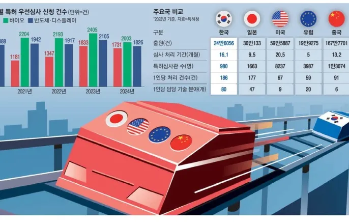 국부못지키는특허청특허심사처리에16개월걸려우선심사제도도취지무색등록1건지연될때3억원손실韓,신기술먼저개발해놓고재산인정안돼눈뜨고뺏길판소송에무효화되는특허최대기술탈취·법적분쟁우려급증가장큰이유는심사관인력난담당분야넓고전문성도부족국내반도체기업A사는2023년9월특허를출원하고같은달우선심사를신청했다.약1년만인2024년10월의견제출통지서(OA)를받았고같은해12월의견·보정서를제출해올해5월등록결정을받았다.출원부터등록까지1년8개월가량이소요된것이다.미국과중국을필두로세계가치열한특허전쟁을벌이고있는가운데,우리의미래와명운이달린'국가전략기술'마저특허심사지연에발목이잡혀있다.특허청은이차전지와반도체,바이오등국가전략기술은우선심사제를적용해빠른심사를추진중이다.그러나신기술이쏟아져나오는속도를따라잡지못해,대한민국의지식재산을제대로지키지못하는것은물론'국부(國富)'가줄줄새고있다는지적이나온다.8일특허청과대한변리사회등지식재산업계에따르면,반도체·디스플레이분야심사처리기간은지난해기준평균13.6개월이소요됐다.2020년11.2개월에서오히려더늘어난것이다.바이오분야도마찬가지여서2020년11.8개월걸리던것이지난해에는17.6개월까지길어졌다.'패스트트랙'으로만든우선심사신청건수도폭증하고있다.이차전지의경우2020년976건이었던우선심사신청건수는2023년1833건으로2배가량치솟았고지난해에도1731건을기록했다.익명을요구한한변리사는"출원부터등록까지처리속도가너무느리다.우선심사를신청해도크게다르지않은상황"이라고지적했다.우선심사병목현상에일반심사건들도타격을받고있다는것역시문제다.우선·일반심사를모두합친전체처리기간은2020년11.1개월에서지난해16.1개월로늘어졌다.한업계관계자는"우선심사대상이아닌작은기술기업들의고충이더커지고있다"며"이런기업일수록특허하나가갖는가치가큰데,제때특허가안나오면서투자를받지못하는것은물론사업자체가휘청이는경우도많다"고말했다.지식재산이제때인정받지못하면국가경제적손실도커진다.특히요즘처럼인공지능(AI)등신기술이빠르게확산되는시기에는심사연기에따른국부손실이막대할것으로업계는보고있다.미국과중국이앞다퉈신기술을쏟아내는상황에서,먼저기술을개발하고도'재산'으로인정받지못해눈뜨고빼앗길수있다는이야기다.한국의특허청심사관1인당처리건수는세계1위다.중국의2배,미국과유럽과비교하면3배나된다.상황이이렇다보니가장밀접하게소통해야할변리사들이담당심사관들과통화하기도어렵다.익명을요구한또다른변리사는"특허출원을담당한변리사와심사관이긴밀하게소통해야하는데,격무에시달리다보니통화조차힘든경우가많다"고지적했다.한국의'특허무효율'이높은이유도여기에있다.무효율은심판또는소송이제기된특허중에무효화된특허의비율을뜻한다.무효율이높다는것은특허의가치와신뢰도를떨어뜨리고,기술탈취나법적분쟁이야기될확률이높아진다는의미다.한국의특허무효율은2023년기준44.4%다.일본11.5%에비해크게높다.한편한국의전체특허출원수는연평균2.1%늘어나며꾸준히증가세다.반도체·디스플레이와바이오분야도연평균출원이각각6.3%,3.7%늘었다.어렵게출원한국가지식재산을하나라도더지키려면,국가차원에서특단의대책을마련해야한다는지적이나온다.우선심사제일정한요건을갖춘특허출원에대해다른출원보다우선심사해주는제도.특허청은국가전략기술보호를취지로반도체·디스플레이,이차전지,바이오,인공지능(AI),첨단로봇등의분야기술들도우선심사대상으로지정했다.[고재원기자]Copyright©매일경제&mk.co.kr.무단전재,재배포및AI학습이용금지