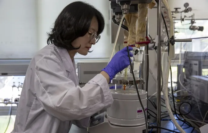 -기존루테늄촉매대비활성화에너지20%↓,수소생성률1.7배↑한국에너지기술연구원연구진이개발한기술로촉매합성실험을하고있다.[한국에너지기술연구원제공][헤럴드경제=구본혁기자]한국에너지기술연구원수소연구단구기영박사연구팀은기존방식보다3배더높은분해성능을갖춘신개념촉매기술개발에성공했다.3개의수소원자와1개의질소원자로구성된암모니아는수소함량이높아장거리운송과대용량저장이가능한수소운반체로주목받고있다.이미전세계적으로운반,저장인프라가갖춰져있어다른수소운반체에비해경제적으로수소를운반할수있다.하지만수요지에서암모니아를분해해수소를생산하는기술은아직초기개발단계에머물러있다.이기술의핵심은루테늄(Ru)촉매다.루테늄을사용하면다른촉매보다100도이상낮은500도~600도의온도조건에서도암모니아를빠르게분해할수있다.문제는루테늄이소수의국가에만존재하는매우희귀한금속이라구하기어렵다는점이다.현재까지는적은양으로도성능을내기위해크기를나노수준으로줄여활용하고있다.하지만나노촉매는대량생산공정이복잡하고제조비용도높아암모니아분해기술의상용화를저해하고있다.연구진은촉매의경제성을개선할수있는폴리올공정기반의신개념루테늄촉매합성법을개발했다.이를통해생산한촉매는기존촉매에비해3배이상높은암모니아분해성능을나타냈다.연구진이개발한촉매(왼쪽파우더형태,오른쪽펠릿형태).[한국에너지기술연구원제공]폴리올공정은주로금속을나노입자로합성하는데쓰이는공정이다.기존공정에서는입자끼리뭉치는현상을막기위해안정화제를넣는데,이로인해공정이복잡해지고비용도증가한다는단점이있었다.이에연구진은안정화제를사용하지않고도나노입자의응집을제어하는방법을고안했다.연구진은탄소사슬이라불리는유기분자의길이가입자의응집정도에영향을준다는점에주목했다.탄소사슬의구조와길이를조절하면첨가제없이도나노입자의응집을효과적으로억제할수있다고본것이다.실험을통해탄소사슬길이가긴부틸렌글리콜을활용하면안정화제없이도2.5나노미터(nm)크기의루테늄입자가균일하게분산되고수소생성반응이일어나는‘B5사이트’가형성된다는것을확인했다.이번연구결과가게재된국제학술지‘스몰’표지이미지.[한국에너지기술연구원제공]이를통해생성된촉매는기존촉매의성능을크게웃돌았다.부틸렌글리콜을사용하지않은기존루테늄촉매와비교했을때,활성화에너지는약20%낮아졌고수소생성률은1.7배증가했다.또한단위부피당암모니아분해반응성능을비교한결과,기존합성법으로만든촉매보다3배이상높은것으로나타나뛰어난경제성을보였다.구기영박사는“이번에개발된암모니아분해촉매합성기술은기존나노촉매대량제조의한계와비용문제를해결할수있는실용적인기술로,암모니아분해촉매기술국산화와실용화에기여할수있을것”이라며“앞으로펠릿촉매양산과다양한암모니아크래킹시스템적용을통해성능검증을진행할계획”이라고밝혔다.이번연구성과는나노분야국제학술지‘스몰(Small)’표지논문으로게재됐다.Copyright©헤럴드경제.무단전재및재배포금지.