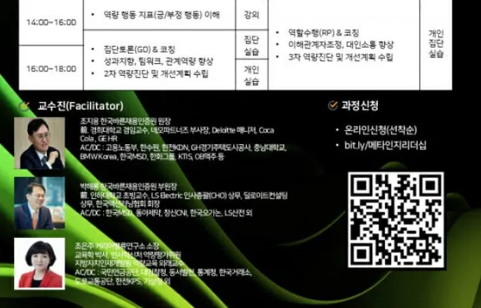 7월10~11일'메타인지리더십과정'개최(지디넷코리아=백봉삼기자)한국바른채용인증원(원장조지용)은7월10일과11일양일간,공공부문승진후보자를대상으로'메타인지리더십과정'을개최한다.이과정은공무원및공공기관의예비리더들이실제직무역량을진단하고개선해역량평가·승진준비도를제고하는데중점을두고있다.조지용원장은이번교육의취지에대해"승진이나역량평가를앞둔예비리더들이본인의강점과약점을명확히파악하고,이를바탕으로실질적인리더십을개발할기회를제공하는데목적이있다"고설명했다.특히주목할점은'메타인지리더십'접근방식이다.이는실제리더가직면할수있는모의상황과제를체험하게해참가자스스로의판단,결정,행동양식에대한다각적인피드백을제공함으로써자연스러운행동변화를촉진하는방식으로진행된다.승진후보자메타인지리더십과정소개본과정은리더십역량강화를위한다음과같은체계적인프로그램으로구성된다.역량및역량평가에대한이해:역량평가의기본개념과중요성을학습한다.어세스먼트센터(AssessmentCenter)도구이해:평가센터에서활용되는다양한도구들을실질적으로학습한다.서류함기법(In-basket)실습:실제업무상황과유사한안건처리를통해정책기획,의사결정,조직관리능력을함양한다.집단토론(GroupDiscussion)실습:성과지향,이해관계자조정,팀워크능력을강화한다.구두발표(OralPresentation)실습:문제해결,의사소통능력을강화한다.역할수행(RolePlay)실습:곤란한상황에서의리더십,의사소통및이해관계자조정능력을배양한다.개별코칭및피드백:전문가의맞춤형코칭을통해개선점을성찰하고발견한다.진단결과리뷰및리더십역량개발계획수립:개인별역량진단결과를분석하고,리더십성장및개선을위한구체적인계획을수립한다.임종순한국정책분석평가학회이사(전한국가스공사부사장)은“앞으로공공부문리더들은예측이어려운불확실성속에서답을찾아야하는어려운임무를맡게되는데,금번한국바른채용인증원의‘메타인지리더십과정’은이에필요한역량을배양하는좋은기회가될것”이라고추천했다.김상덕한국기업재난관리사회부회장(전남부발전인사처장)은"역량평가는조직의리더에게필요한기본적인역량을확보하였는지여부를확인하는절차로,평소에쌓아온본인의역량을주어진특정상황에맞게잘적용할수있도록평가도구에대한적응훈련이필요하다"며"이번에한국바른채용인증원에서기획한평가도구별실습중심의‘메타인지리더십'과정은승진후보자들에게큰도움이될것으로기대된다"고밝혔다.김석진한전KDN인재개발원장은“본과정은리더의역량진단을통해본인의강점과약점을구체적이고객관적으로파악하고리더십코칭을통해실질적인행동변화유도로전략적사고역량,의사소통능력등을향상시킬수있는교육이라고생각한다”고말했다.본교육에는조지용원장외에도공무원및공공기관역량평가및역량개발교육에풍부한경험을가진전문퍼실리테이터들이코칭과피드백에참여한다.백봉삼기자([email protected])Copyright©지디넷코리아.무단전재및재배포금지.