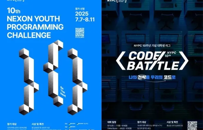 넥슨(공동대표강대현김정욱)이NYPC10주년기념대학생리그NYPC코드배틀과제10회‘넥슨청소년프로그래밍챌린지’(이하NYPC2025)를개최한다고밝히고대회일정을공개했다.올해로10주년을맞이한NYPC는기존청소년대상프로그래밍대회에이어,참가자들의지속성장기반을마련하기위한대학생대상의특별리그‘NYPC코드배틀’을새롭게선보인다.이는국내최초로시도되는팀전략형프로그래밍대회로,참가자들은주어진게임환경에서승리할수있는최적의전략으로코드를개발하고상대팀과대결하며문제해결력과협업역량을겨룬다.먼저‘NYPC코드배틀’은국내외대학학사과정학생또는20세이상25세이하(2001년생부터2006년생까지)라면누구나1~4인으로팀을구성해참여할수있다.참가신청은7월7일부터8월18일까지공식사이트(https://battle.nypc.co.kr)에서진행된다.또전국대학생대상의‘코드배틀:캠퍼스리그’이벤트를통해참가자들이온라인미니게임으로대회문제를미리경험해볼수있는기회를제공한다.‘NYPC코드배틀’은온라인라운드와파이널라운드로구성되며,각라운드별로정답이정해지지않은각1개문항이출제된다.온라인라운드는8월8일부터8월18일까지진행되며,상위20팀에게는오는10월25일에판교넥슨사옥에서열리는파이널라운드참가자격이주어진다.또한NYPC2025는프로그래밍에관심있는12세이상19세이하(2007년생부터2014년생까지)청소년이라면누구나대회에참여할수있다.참가신청은7월7일부터8월11일까지NYPC공식홈페이지(www.nypc.co.kr)에서진행된다.NYPC2025의Round1은8월7일부터11일까지온라인으로시행되며,일정점수를획득하면다음라운드로진출할수있는절대평가방식이다.Round2는8월17일과8월23일양일간제한된시간내에온라인으로진행된다.NYPC2025본선대회는‘NYPC코드배틀’파이널라운드와함께오는10월25일판교넥슨사옥에서개최된다.넥슨재단김정욱이사장은“올해NYPC는10회째를맞이하는만큼청소년과대학생모두가즐길수있는새로운도전의장을다양하게마련했다”며“참가자들이창의력을발휘해서로협력하는과정에서미래인재로서한단계더성장할수있도록대회준비에최선을다하겠다”고말했다.한편,넥슨은NYPC10주년을기념해다양한이벤트를마련했다.‘NYPC10주년FESTA:NYP씨를찾습니다’에서는역대수상자와참가희망자를대상으로특별강연과게임이벤트등을열어‘도전’의가치를재조명한다.또대회IP기반의굿즈를판매해수익금을전액기부하는‘NYPC굿즈샵’도운영할예정이다NYPC2025및코드배틀공식포스터사용자중심의게임저널-게임동아(game.donga.com)Copyright©게임동아.무단전재및재배포금지.