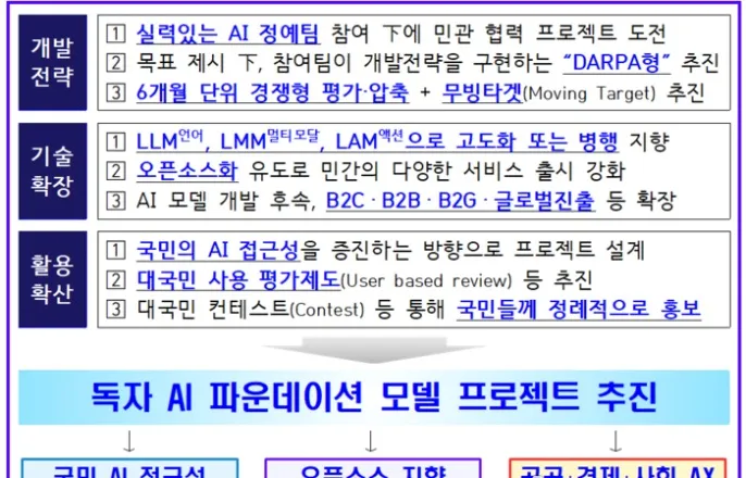 '독자AI파운데이션모델'프로젝트추진방향.과학기술정보통신부제공국가대표인공지능(AI)모델확보를위한거대언어모델(LLM)개발프로젝트가가동된다.과학기술정보통신부가정보통신산업진흥원(NIPA)·한국지능정보사회진흥원(NIA)·정보통신기획평가원(IITP)과'독자AI파운데이션모델'프로젝트에참여할국내정예팀공모에착수한다.기존월드베스트LLM(WBL)가칭으로부르던프로젝트명을독자AI파운데이션모델로확정했다.글로벌수준의독자AI파운데이션모델이국내에오픈소스로확산되면다양한AI서비스출시와경제사회전반의AI전환이가속화될것으로전망된다.AI기술발전으로사회적편익이확산되는기반으로작용할것이라는판단에따라추진되는프로젝트다.정부는글로벌파급력있는독자AI파운데이션모델확보를목표로민·관협력을추진한다.실력있는국내AI기업·기관중심정예팀(컨소시엄가능)을대상으로공모한다.최대5개정예팀을선발,단계평가로경쟁형압축을추진한다.최대5개팀으로시작해경쟁을통해지원팀을줄여가는방식이다.특히,미래AI인재육성관점에서대학·대학원생참여를필수로한다.6개월이내출시된최신글로벌AI모델대비95%이상성능을목표로,참여할정예팀이구체적인개발전략과방법론을주도적으로제시할수있다.목표와방법론등은단계평가마다무빙타깃방식을도입,급변하는AI기술환경에유연하게대응할방침이다.목표만제시,구체적전략과방법론은정예팀이구현하면된다.참여정예팀은독자AI파운데이션모델개발에필요한그래픽처리장치(GPU),데이터,인재등희망자원을자유롭게제시할수있다.정부는추후평가등으로적정규모를검토해지원할계획이다.국민AI접근성증진,공공·경제·사회AI전환지원등국내기여계획도제시해야한다.참여기업규모와오픈소스수준에따라정예팀매칭비율이차등화될예정이다.다양한분야국내외AI전문가가참여하는평가위원회를구성해평가를진행,프로젝트지향점에걸맞는정예팀을선정한다.오는12월등에이뤄지는6개월단위단계평가의경우콘테스트기반국민·전문가평가,국내외벤치마크와한국어성능·안전성검증체계기반검증평가,파생AI모델수기반파생평가등이연계되는입체적평가를추진할방침이다.GPU도지원한다.내년상반기까지는민간이보유한1576억원규모GPU를임차지원한다.이후정부구매GPU1만장을활용해지원,팀당GPU500장부터시작해1000장이상규모GPU를지원할예정이다.또모든정예팀의저작물데이터공동구매와개별정예팀의데이터구축·가공을지원한다.팀당데이터공동구매는연간100억원,데이터구축·가공은연간30억~50억원규모다.또정예팀이해외우수연구자(팀·재외한인가능)를주도적으로유치할경우인건비·연구비등필요비용을정부가매칭지원한다.2027년까지연간20억원규모지원이이뤄진다.정예팀이개발한독자AI파운데이션모델은오픈소스를지향,국내AI생태계확산에활용한다.AI안전연구소와의협업해독자AI파운데이션모델의안전성검증을뒷받침하고'K-AI모델','K-AI기업'등명칭을사용할수있도록해글로벌공신력강화와글로벌시장진출가속화를도모한다.송상훈과기정통부정보통신정책실장은“AI시대대한민국기술주권확보,모두의성장을도모하는생태계구축이목표”라며“국내최고수준AI정예팀들이도전해글로벌수준의독자AI파운데이션모델을확보·확산,대한민국이AI강국으로도약하는'모두의AI'출발점이되기를기대한다”고말했다.박종진기자[email protected]©전자신문.무단전재및재배포금지.
