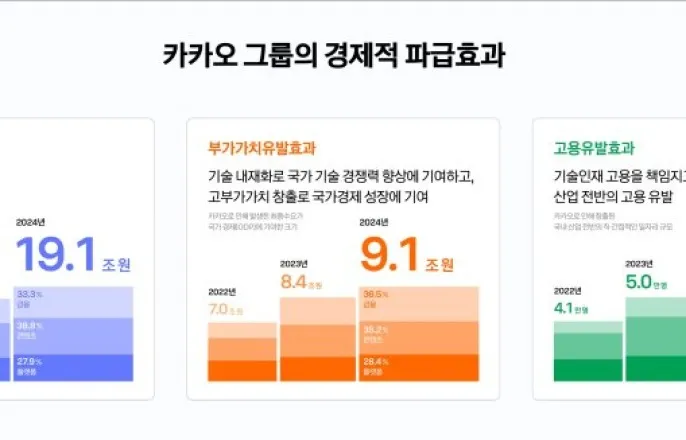 카카오"지난해생산유발효과약19조1000억원"[파이낸셜뉴스]카카오가지난해직·간접적으로창출한경제적성과는생산유발효과19조1000억원,부가가치유발효과9조1000억원,고용유발효과5만4000명에달하는것으로집계됐다.카카오는이같은내용을담은2024년카카오그룹의경제적파급효과분석결과와2025년사회경제적가치를설명한122개의지표를9일발표했다.이번발표는지난해에이어두번째로,카카오는우리나라경제에대한기여도를객관적으로측정하기위해경제적파급효과를지난해부터산출해오고있다.카카오에따르면모바일메신저를시작으로문화콘텐츠,금융,모빌리티등다양한분야에서디지털생태계를구축해온결과,최근3년간누적경제적파급효과는생산유발효과51조4000억원,부가가치유발효과24조5000억원,고용유발효과약14만5000명에달하며,지속적인상승세를이어가고있다.이번에종합발표된지표들은카카오그룹의다양한사회경제적가치를객관적수치로한눈에확인할수있도록정리했다.올해는지난해10개사의60개지표에서나아가,11개사의122개지표로분석범위를한층넓힌것이특징이다.카카오의기부플랫폼‘카카오같이가치’를통해조성된누적기부금은2025년4월기준936억원에달했으며,모금프로젝트수는1만9000개에이른다.일상속에서손쉽게참여할수있는기부문화의활성화에기여했다.임팩트커머스‘카카오메이커스’를통한판로지원으로제값을다한농축수산물은6859톤,‘새가버치프로젝트’를통해새활용된물건은912만개를기록했다.이모티콘누적발신건수는2800억건,출시된이모티콘수는70만개로창작자생태계확대에기여했다고카카오는평가했다.특히이번에는각사별로성과를나열하던방식에서나아가,카카오서비스가창출한사회경제적가치를이용자·파트너·사회등이해관계자별기여가치기준으로10가지분야로구분해제시했다.이를통해카카오그룹이△일상의편의제고△사회안전망강화△사회·환경문제대응△국민건강관리△소상공인성장△디지털전환△소프트파워생태계강화△스타트업육성△이용자경제부담완화△경제격차해소등10개분야에서기여해온성과를확인할수있다.카카오CA협의체권대열ESG위원회위원장은“카카오그룹은이번에확인된10가지핵심분야를중심으로사회경제적가치를더욱확대해나가기위해노력할계획”이라며“특히카카오만의유익한소셜임팩트를보다폭넓게실현할수있도록,사회및파트너들과더소통하고협력해나가겠다”고말했다[email protected]조윤주기자Copyright©파이낸셜뉴스.무단전재및재배포금지.