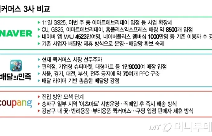퀵커머스3사비교/그래픽=김지영배달의민족(이하배민)이독주하는퀵커머스시장에네이버(NAVER)가도전장을냈다.국내이커머스시장에서쿠팡과자웅을겨루고있는네이버가퀵커머스시장을선점하려는의도로보인다.쿠팡도이시장공략을타진하고있어세기업이벌일진검승부에업계가주목하고있다.━퀵커머스사업빠르게확장하는네이버…배달능력은'글쎄'━19일IT업계에따르면네이버의AI(인공지능)커머스애플리케이션'네이버플러스스토어(이하네플스)'는최근'지금배달'에GS25와이마트에브리데이를입점시키는등빠르게퀵커머스영토를확장하고있다.'지금배달'은지난달15일CU입점과함께출시한퀵커머스서비스다.지난11일GS25를,12일에는이마트에브리데이를추가입점시켰고,총8500여개의편의점·기업형슈퍼마켓매장이입점하는등사업진행속도가빠르다.지금배달은사용자주변1.5km내편의점·기업형슈퍼마켓(SSM)등의상품을1시간내외로배송하는퀵커머스서비스로,네플스앱과웹에서사용할수있다.네이버가퀵커머스에열을올리는건경쟁자쿠팡에앞서퀵커머스시장에진출하기위함으로풀이된다.네이버는높은이용자수가강점이다.아이지에이웍스모바일인덱스에따르면네이버앱은지난달4523만여명의MAU(월간활성이용자수)를기록했다.네이버플러스멤버십가입자는1000만명을훌쩍넘는것으로추정되고,네플스는지난달출시세달만에490만명을넘는MAU를기록했다.네플스가탄탄한네이버이용자층을기반으로빠르게성장했듯,지금배달도가파른성장세를그릴것으로기대하고있다.네이버는멤버십이용자가지금배달을이용하면추가적립혜택을주는등강력한마케팅정책을펴고있다.다만배달능력에의문부호가찍힌다.네이버는자체투자대신CU,GS25등의이륜차배달망을활용해상품을배달한다.자체배달망구축비용을절감하고빠르게사업확장은가능하지만실효성의문이있다.업계에서는이미편의점들이배달능력에서배민에밀려퀵커머스시장에서고전하는점을고려할때,자체투자없이단순협업만으로는시장점유율확대가쉽지않을것으로본다.━배달라이더기반으로시장선점한배달의민족…고민중인쿠팡━퀵커머스1위배민의'장보기·쇼핑'에는1만9000여개의편의점,기업형슈퍼마켓,대형마트등이입점해있다.물류센터도거대하다.배민은서울,경기,대전,부산,전주등지에약70여개의자체도심물류센터PPC(PickPackingCenter)를구축했다.이에배민의퀵커머스를대표하는상품매출(B마트포함)은2022년5123억원,2023년6880억원,지난해7568억원으로성장했다.지난해처음으로상각전영업이익(EBITDA)기준흑자를달성했다.배민은음식배달라이더를기반으로한촘촘한배달망이강점이다.한업계관계자는"배민은라이더숫자도많이확보하고있고빨리라이더를매칭하는노하우도갖고있다"고말했다.반면쿠팡은퀵커머스진입이가장늦다.쿠팡은현재송파구일부지역에서만'이츠마트'를시범운영하고있다.물품을직매입해보관하다가주문이들어오면즉시배송하는방식이다.강남구에서는최근쿠팡에입점한판매자와제휴해꽃·반려용품·뷰티용품을단시간내배송하는퀵커머스서비스를시작했다.이종우아주대경영학과교수는"쿠팡은도심외곽에대형물류센터를다수확보한상태"라며"퀵커머스를위해서는도심내마이크로물류센터가필요한데쿠팡은최근이익이나기시작해신규투자가부담스러울수있다"고말했다.한편퀵커머스시장은빠르게성장하고있다.글로벌리서치전문기관스태티스타는국내퀵커머스매출이2024~2029년간매년7.49%성장할것이라전망했다.이찬종기자[email protected]©머니투데이&mt.co.kr.무단전재및재배포,AI학습이용금지.