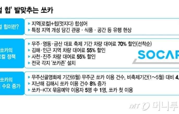 '로컬힙'발맞추는쏘카/그래픽=김지영"로컬은DIY같아요.색채가다른여러지역을다닐수록'나만의길'을찾을수있게돼요."최근MZ세대를중심으로특정지역만의개성이담긴관광,식품,공간등이트렌디하다는'로컬힙'('지역'을뜻하는'로컬'+'멋지다'는뜻의'힙')열풍이분다.이에차량공유플랫폼쏘카가발빠르게지방자치단체와협약을맺고다양한프로모션을진행하는등'로컬힙'을바탕으로성장전략을짜고있다.10일쏘카에따르면'무주산골영화제'가열린지난6월전북무주군에서의쏘카이용건수는지난1~5월평균이용건수의4.76배에달했다.전년동월대비로도38%증가했다.쏘카는지난4월부터전북무주군,충북영동군,충남금산군등3개지자체와업무협약을맺고,각지역대표축제기간해당지역을방문한고객에게선착순으로차량대여료를70%할인하는이벤트를벌이고있다.지난달열린'무주산골영화제'를시작으로올해9~10월열리는'영동세계국악엑스포','금산세계인삼축제'에서도같은혜택을제공할예정이다.각지역주요거점에쏘카공유차량을주차·대여할수있는'쏘카존'설치도추진한다.쏘카는지난해에도'김해방문의해'를맞아김해시와업무협약을맺고이지역및인근지역에서의쏘카차량대여료를55%할인했다.지난해대여료할인지역에서의쏘카이용건수는전년대비8%증가했다.쏘카는올해김해시와협약을재체결해연말까지할인혜택을계속제공하는동시에,사천시와진주시까지할인지역을확대했다.코레일과묶어예약하면할인혜택을주는'쏘카-KTX묶음예약서비스'로외연도넓힌다.이는쏘카앱내에서KTX와도착역인근차량대여를한번에예약하면최대40%의할인혜택을제공하는서비스다.주이용층인20·30대가지방여행시대중교통을활용하는것을고려했다.2023년부터지난해말까지쏘카-KTX묶음예약이용자5명중1명이이서비스로쏘카를처음이용하는등이용층확대에도움이되고있다.쏘카가이처럼지역에힘을쏟는건주요이용층인20·30대를중심으로'로컬힙'열풍이불고있어서다.한국관광공사가2023년발표한설문조사에따르면전체응답자1000명중58.8%가로컬관광의향이있다고답했다.실제대구지역번호'053'이들어간티셔츠는매년매진사례다.이마트24,CU등편의점들은'성주참외콘','고창복분자떡갈비버거'등로컬연계상품을출시한다.아이지에이웍스모바일인덱스에따르면올해상반기기준쏘카20·30대이용률은68.6%에달한다.지방은수도권에비해지하철이나버스등대중교통이상대적으로불편하다.이에택시호출플랫폼과카셰어링업계간여행객선점경쟁이치열하다.지방일수록이동거리가멀어택시호출보단카셰어링이유리한만큼쏘카에새로운수요창출기회가될수있다.여행객은차량이용시간이길어매출증대에도도움이된다.쏘카차량대여료는이용시간과주행거리에비례해측정된다.쏘카관계자는"문경,철원,횡성등전국각지에포진한5000개쏘카존을활용하면어디서든로컬여행을편하게즐길수있다"며"로컬힙이인기인만큼,앞으로도쏘카의카셰어링을통해전국방방곡곡을방문할수있도록도울것"이라고밝혔다.이찬종기자[email protected]©머니투데이&mt.co.kr.무단전재및재배포,AI학습이용금지.