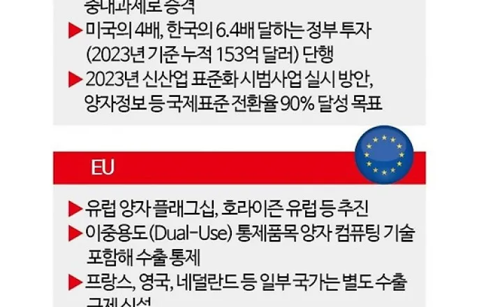 기술강국들10년전부터정책수립국가전략기술지정…수출통제확대미국과중국,유럽연합(EU)등주요기술강국들은10여년전부터국가차원에서양자정보기술관련정책을수립하고,대규모예산을투입하면서자국기술보호를위한국가전략기술지정및수출통제도확대하고있다.핵심동맹국과의교류만허용하는등미국과중국을중심으로한편가르기현상도뚜렷하다.미국은국립과학재단(NSF),국립표준기술연구소(NIST),에너지부(DOE),국방부(DOD)등관계부처를포괄하는종합지원체계를구축하고,2019년부터2023년까지약39억달러(약5.5조원)를투자했다.이어2029년까지국제협력과응용개발지원등에약27억달러(약3.7조원)를추가투자하기위해'국가양자이니셔티브재승인법'제정을추진중이다.기술리더십유지를위해반도체·AI·양자컴퓨터분야의중국투자를금지하고,양자컴퓨팅,첨단반도체제조등핵심신기술및관련장비,소프트웨어등을수출통제대상으로지정했다.또AUKUS(호주·영국·미국)안보협력동맹등을통해양자컴퓨팅협력및대중국공동대응을강조하고있다.중국은2021년14차5개년계획에서양자정보기술을국가중대과제로승격하고,미국의4배,한국의6.4배에달하는정부투자(2023년기준누적153억달러)를단행했다.2023년8월신산업표준화시범사업실시방안에9대미래산업으로'양자정보'를포함,범용핵심기술및응용과학기술프로젝트표준신규제정률60%이상달성,국제표준300건이상제정,중요분야국제표준전환율90%달성을성과목표로설정했다.또JTC3총회에15여명규모의대표단을파견하는등표준화에적극적으로활동하고있다.하지만,서방국가들의암묵적견제로상황을주도하지못하고있다.EU는뛰어난기초과학기술을보유하고도IT산업을선도하지못한과거를되풀이하지않기위해양자시대산업선도를천명하고유럽양자플래그십,호라이즌유럽등을추진중이다.특히이중용도(Dual-Use)통제품목에양자컴퓨팅기술을포함해수출을통제하고있으며,프랑스와영국,네덜란드등일부양자기술선도국은최근별도의수출규제를신설했다.우리나라도2024년4월2034년까지6조원을투자해양자기술강국으로도약하겠다는'퀀텀이니셔티브'전략을발표,연구·개발(R&D)투자확대,기술상용화와국제표준화등을추진중이다.지난2월극자외선(EUV)마스크·레티클,극저온측정장비등첨단산업분야기술을수출통제전략물자로지정,미국의대중견제정책을보조하고있다.박성수연세대학교융합과학기술원교수는"국제표준화과정에서도드러내놓고문제를제기하지는않지만,중국등에대한견제가있는것은사실"이라면서"중국은대부분의기술을독자개발하는등성과를내면서국제무대에서자체개발기술표준화를추진하고있다.한국의지혜로운대처가필요한시점"이라고말했다.김종화기자[email protected]©아시아경제.무단전재및재배포금지.