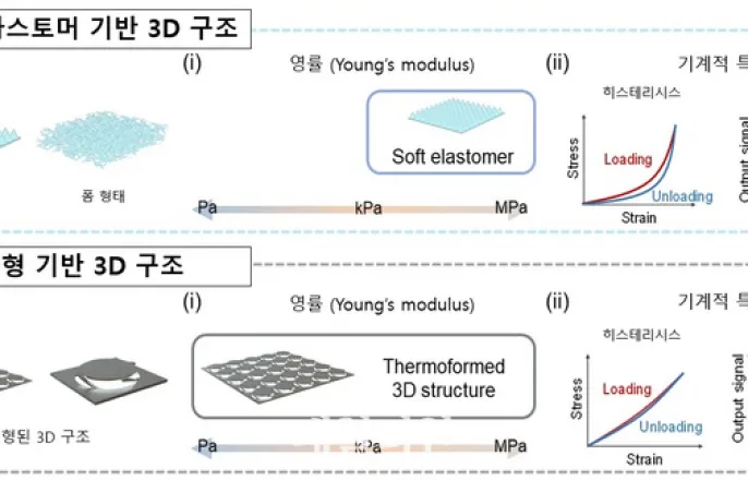 고정밀·고속응답구현한T3DE로맥박·소리·압력감지생체조직유사강성구현…의료·재활·VR등활용기대연구이미지.ⓒ한국과학기술원한국과학기술원(KAIST)은박인규기계공학과교수연구팀이국가과학기술연구회(NST)산하한국전자통신연구원(ETRI)과공동연구를통해기존촉각센서기술의구조적한계를극복한혁신적기술을개발했다고23일밝혔다.이번공동연구의핵심은‘열성형기반3차원전자구조(T3DE)’를적용해유연성과정밀성,반복내구성을동시에확보한맞춤형촉각센서를구현했다.소프트엘라스토머(고무,실리콘등쭉늘렸다가놓으면다시원래모양으로돌아오는재료)기반센서가갖는느린응답속도,높은히스테리시스,크립(오랫동안힘을가했을때재료가천천히변형되는현상)오차등구조적문제를극복하면서도다양한환경에서정밀하게작동하는플랫폼으로주목받고있다.T3DE센서는2차원필름위에정밀하게전극을형성한후,열과압력을가해3차원구조로성형하는과정을통해제작된다.특히센서상부의전극과지지다리구조는목적에따라기계적물성을조절할수있도록설계돼있다.지지다리의두께,길이,개수등미세한구조매개변수를조정함으로써센서의영률(Young’smodulus)을10Pa에서1MPa까지폭넓게설정할수있다.이수치는피부,근육,힘줄등의생체조직과유사한수준으로,실제생체인터페이스용센서로도유용하다.이번에개발된T3DE센서는공기를유전체로활용해전력소비를줄이고민감도,응답속도,온도안정성,반복정밀도측면에서도우수한성능을보였다.실험결과,해당센서는민감도5,884kPa⁻¹,응답속도0.1ms(1000분의1초보다짧은시간),히스테리시스0.5%이하,5000회반복측정에서도정밀도99.9%이상을유지하는내구성을입증했다.연구팀은이센서를활용해고해상도40×70배열해,총2800개센서를촘촘히구성,운동중발바닥의압력분포를실시간시각화하고,손목맥박측정을통한혈관건강상태평가가능성도확인했다.또상용음향센서수준의소리감지실험에서도결과를얻었다.이센서는발바닥압력,맥박,소리까지매우정확하고빠르게측정할수있어서운동,건강,소리감지등다양한분야에활용될수있다.T3DE기술은증강현실(AR)기반외과수술훈련시스템에도적용됐다.각센서요소마다서로다른영률을부여해실제생체조직과유사한강성을구현했다.수술절개시가해지는압력강도에따라시각·촉각피드백을동시에제공하고,너무깊이베거나,위험한부위를건드리면실시간위험경고기능까지갖춘시스템이구현됐다.이는의료교육의몰입도와정확성을획기적으로향상할수있는기술로평가된다.박인규교수는“이센서는설계단계에서부터정밀하게조절할수있어다양한환경에서도안정적으로작동한다”며“일상생활은물론의료,재활,가상현실등다양한분야에서쓸수있을것”이라고밝혔다.Copyright©데일리안.무단전재및재배포금지.