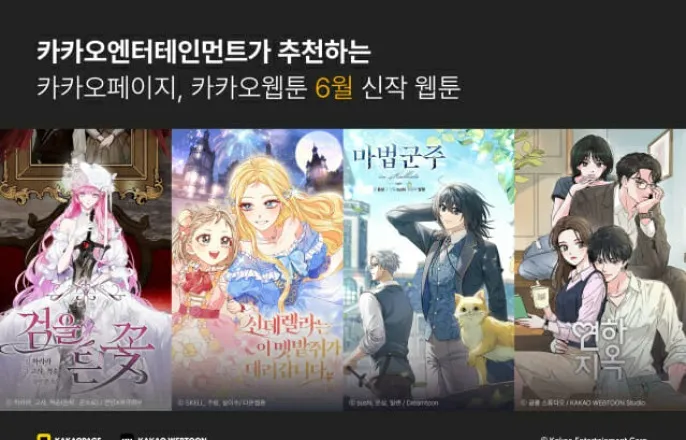 ‘검을든꽃’,‘신데렐라는이멧밭쥐가데려갑니다’,‘마법군주’,‘연하지옥’선봬(지디넷코리아=안희정기자)카카오엔터테인먼트(대표권기수,장윤중)가카카오페이지,카카오웹툰6월화제의신작웹툰4종을공개했다.카카오페이지를대표하는인기작작가들의웹소설을각색한신작을비롯해발랄한로맨틱코미디웹툰등이다채롭게준비돼관심을모은다.은소로작가의레전드로판대작을웹툰으로!로맨스와액션,탄탄한스토리텔링이주는쾌감으로웹툰,웹소설모두1위‘검을든꽃’카카오페이지에서지난6일선보인‘검을든꽃’은은소로작가의동명원작을각색한노블코믹스웹툰이다.웹소설‘검을든꽃’은로맨스판타지팬들사이에꼭봐야할입문서로평가받는작품으로,지금까지조회수1.1억회를올렸다.특히2017년원작이완결된후무려8년만에선보이는웹툰으로서뜨거운반응을모으고있다.실제웹툰‘검을든꽃’은공개와동시에카카오페이지웹툰로맨스판타지주간랭킹1위에올랐으며,이열기를이어받은웹소설원작도다시금웹소설로맨스판타지주간랭킹정상에자리매김했다.작품의주인공은로아즈백작가의장녀‘에키네시아’.마검에잠식돼가장사랑하던사람들을죽였던그녀는간절한소원으로비극이시작되기전인20살과거로돌아온다.그리고마검의저주를뿌리치고이번에는진정으로행복한삶을꾸리겠다고다짐한다.검사로서누구보다뛰어난검술실력은물론특유의영민함으로운명을개척해나가는주인공의모습이쾌감을안기는한편로맨스의설렘도놓치지않는작품이다.특히다른로맨스판타지에서는찾아보기어려운크리처전투등다채로운액션이더해진작품으로박진감또한전한다.6천500만회조회수를기록한카카오페이지‘남편이미모를숨김’의그림을그려큰사랑을받은하라라작가가작화를맡았으며,화사하고아름다운캐릭터표현과묵직한액션신을두루소화하며호평받고있다.카카오엔터6월화제의웹툰신작1.2억뷰‘세이렌’설이수작가의또다른대작을각색한노블코믹스‘신데렐라는이멧밭쥐가데려갑니다’,신데렐라스토리에기반한재기발랄한상상력으로눈길카카오페이지기대신작‘신데렐라는이멧밭쥐가데려갑니다’도지난15일공개돼화제를모으고있다.1.2억뷰를기록한웹소설이자웹툰으로도1.3억회조회수를기록한‘세이렌:악당과계약가족이되었다’설이수작가의원작을바탕으로한노블코믹스여서다.웹툰은카카오페이지로맨스판타지주간랭킹정상에오르는등화제를모으고있으며,특히친숙한동화신데렐라와로맨스판타지인기세부장르인귀여운육아물소재를버무려큰사랑을받고있다.작품은결혼한신데렐라와왕자의이야기로시작된다.둘의사랑은왕자가다른영애와사랑에빠지면서10년만에비극이된다.주인공은신데렐라가아끼고보살피던쥐‘엘로디’다.신데렐라의비극을지켜본엘로디는요정에게소원을빌고,계모와언니들에게구박받던신데렐라의어린시절로돌아가게된다.그리고왕자가유리구두를들고찾아오기전신데렐라를구원하기위해고군분투한다.쥐중에서도몸집이가장작은멧밭쥐를주인공으로앞세운작품은귀엽고깜찍한주인공여자아이의모습을통해읽는내내즐거움을안긴다.또익숙한동화에재기발랄한상상력을더한독창적에피소드를흥미진진하게펼쳐놓는다.정통판타지호흡에‘먼치킨’을더하면,발렌작가원작마법군주로성장하는주인공과그동료들의이야기카카오페이지‘마법군주’오는29일출시하는카카오페이지‘마법군주’는판타지물‘정령의펜던트’와무협물‘천마신교최강하녀’등전작에서장르를넘나들며다채로운스토리텔링을선보여온발렌작가의인기원작을바탕으로한노블코믹스웹툰이다.‘마법’을소재로주인공과동료들의성장기를그린웹소설은정통판타지느낌의탄탄한호흡이두드러지는작품으로,착실한각색과형형색색화려한마법까지누구나좋아할웹툰으로제작됐다.원작은현재카카오페이지에서2천250만회조회수를기록하고있다.웹툰은가문의망나니로불리던칼리스타백작의전속하인으로지내던‘한스’가백작의대리인으로나간전쟁에서허망한죽음을맞고,백작의몸으로환생하며시작된다.원래칼리스타백작과달리하인이지만모든면에서출중했던한스는이번엔자신이가진권력과능력으로본인과동료들의운명을바꿔보겠다고마음먹는다.강력한주인공의활약을그리는‘먼치킨’장르의매력도보유한작품으로,마법이쇠퇴하는세계에서홀로드래곤의힘을보유한주인공이자신과세계를새롭게개척해나가는모습을발빠른전개로그려내며시선을사로잡는다.조회수7천만회‘우리집이거든요!’작가신작,팍팍한현실속피어난순수하고도발적인로맨스카카오웹툰‘연하지옥’카카오웹툰에서16일공개된‘연하지옥’은공룡스튜디오작가의신작이다.조회수7,천만회를기록한전작‘우리집이거든요!’에서각양각색인물과에피소드를촘촘히엮어설렘과감동을선사한작가는‘연하지옥’에서두연상연하커플을앞세워현실적이면서도아름다운로맨스를그려낼예정이다.특히사랑과연애마저계산하게된현대사회에서피어나는발랄한사랑이야기로많은독자들에게공감을전할것으로보인다.작품은엘리트코스를밟아왔지만결혼만은뜻대로되지않는