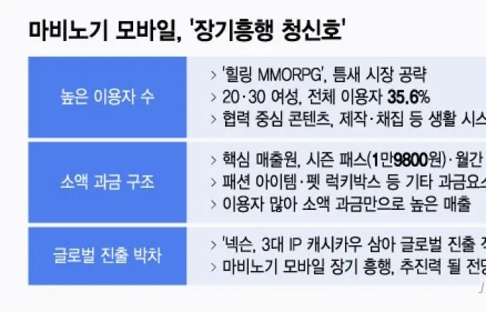 마비노기모바일,'장기흥행청신호'/그래픽=윤선정오는27일출시3개월을맞는'마비노기모바일'이매출순위고공행진을이어간다.많은이용자를확보한덕분에개별이용자의소액과금만으로도매출이커서장기흥행가능성이점쳐진다.글로벌시장을공략할'빅게임'개발자금이필요한넥슨이새로운캐시카우를확보한셈이다.26일아이지에이웍스모바일인덱스에따르면마비노기모바일은지난두달간약540억원의매출을거뒀다.이게임은25일에도앱스토어와구글플레이스토어매출순위에서각각1위와2위를차지했다.이게임은줄곧양대마켓매출순위5위내외를유지하며순항중이다.━'힐링MMORPG',틈새시장공략해이용자확보…소액과금BM으로도충분━마비노기모바일의흥행동력은압도적인이용자수에있다.이게임의지난달MAU(월간활성이용자수)는약100만명으로MMORPG(다중접속역할수행게임)중가장많았다.전체게임중에서는8위다.비슷한시기출시된'RF온라인넥스트'(8만명)는물론,'리니지M'(23만명),'오딘:발할라라이징'(9만명)등인기MMORPG보다5~10배많았다.틈새시장을효과적으로공략한덕분이다.이게임이용자의35.6%는통상적으로MMORPG를하지않는20·30여성이다.PC에서20년이상서비스되며탄탄한마니아층을지닌마비노기IP(지식재산권)에기반해'힐링게임'으로자리매김했다는평가다.마비노기모바일은협력중심콘텐츠,제작·채집등생활시스템,커뮤니티기능등으로인기를끌고있다.전투와경쟁위주의기존MMORPG와다르다.한업계관계자는"IP(지식재산권)효과는어디까지나초반유저모객에그친다"며"마비노기모바일이좋은성적을이어가는건IP를제대로이해한개발진이팬들이원하는콘텐츠를만들었기때문"이라고설명했다.이게임비즈니스모델(BM)상핵심매출원은한달반정도이용할수있는시즌패스(1만9800원)와월간멤버십2종(총1만7800원)이다.이외과금요소는이용자취향에맞는패션아이템,펫럭키박스등으로캐릭터능력치에큰영향을미치지않는다.다른업계관계자는"멤버십방식의소액과금체계는이미게임업계에보편화된비즈니스모델로과금피로도가낮아장기운영이가능하다"며"이용자가많을수록멤버십만으로도충분한수익을거둘수있어유리하다"고했다.지난3월27일넥슨은마비노기온라인이정식출시됐다고밝혔다./사진제공=넥슨━'빅게임'으로글로벌공략노리는넥슨,새캐시카우로청신호━그간3대IP(메이플스토리·FC온라인·던전앤파이터)에서나오는막대한매출로글로벌도전에적극적이었던넥슨에마비노기모바일의장기흥행은청신호가될전망이다.넥슨은지난해7월루트슈터게임'퍼스트디센던트'와지난3월패키지게임'퍼스터버서커:카잔'으로글로벌시장진출을노린바있다.올해는3인칭슈팅게임'아크레이더스'와500만장넘게팔린패키지게임'데이브더다이버'DLC(추가구매콘텐츠)를출시할계획이다.박용현넥슨게임즈대표이사는지난24일넥슨개발자콘퍼런스에서"게임시장은전반적으로정체에빠졌다"며"규모와퀄리티양쪽에서글로벌기존강자들과경쟁할수있는'빅게임'으로글로벌진출에도전해야한다"고말했다.이찬종기자[email protected]©머니투데이&mt.co.kr.무단전재및재배포,AI학습이용금지.