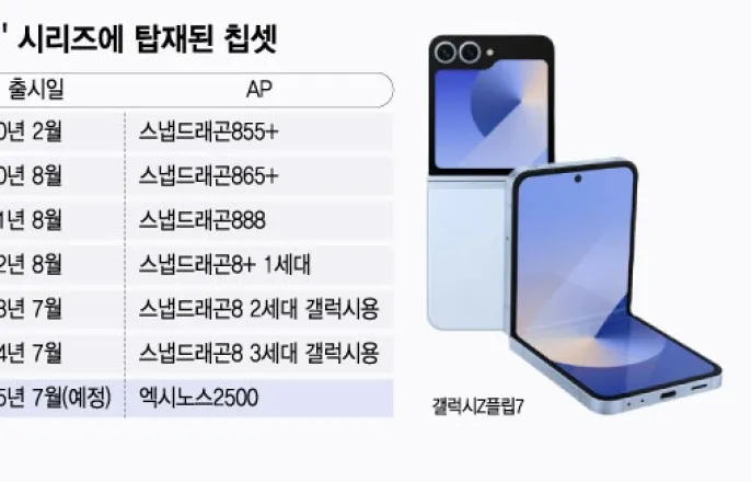 [MT리포트]삼성폰,다시펼칠시간(上)[편집자주]삼성이2019년세계최초로폴더블폰시장을열었지만,중국제조사들의거센추격에독주체제가흔들린다.폼팩터와기능의혁신부재논란속에삼성이다시한번반격에나선다.핵심전략은'초슬림'과'자체AP탑재'다.내달7세대폴더블폰시리즈공개를앞두고삼성의승부수와시장판도변화가능성을짚어본다.━[단독]삼성,자체칩승부수…갤Z플립7'엑시노스'전량탑재확정━①엑시노스적용첫폴더블폰/그래픽=윤선정디자인기자삼성전자가내달공개하는'갤럭시Z플립7'(이하플립7)에'엑시노스'칩셋이전량탑재되는것으로확인됐다.23일업계에따르면삼성은플립7의국내·외모델에'엑시노스2500'을적용한다.국내모델에만엑시노스를적용하고글로벌시장엔스냅드래곤을공급할것이란기존예상과다른흐름이다.같은날공개하는'갤럭시Z폴드7'은퀄컴의'스냅드래곤8엘리트'가탑재되는것으로알려졌다.엑시노스는삼성전자가자체설계·생산하는AP(애플리케이션프로세서)다.시스템LSI사업부가설계를,파운드리(반도체위탁생산)사업부가생산을맡는다.스마트폰의두뇌역할을하는AP는CPU(중앙처리장치),GPU(그래픽처리장치)등핵심부품이통합된SoC(시스템온칩)다.이로써플립7은엑시노스가적용된첫삼성폴더블폰이된다.그동안삼성은갤럭시S시리즈에서지역과모델에따라엑시노스와스냅드래곤을교차적용했지만,폴더블폰에는스냅드래곤만채택해왔다.폴더블폰은구조적으로내부공간이좁고발열제어가까다로워,엑시노스보다성능과효율이좋은스냅드래곤을탑재했던것이다.삼성전자가플립7에엑시노스를전량탑재하는것은제품에대한자신감이반영된것으로풀이된다.엑시노스2500은삼성의3nm(나노미터)2세대GAA(게이트올어라운드)공정으로처음생산되는칩셋이다.전작대비AI연산성능과전력효율,제조안정성측면에서큰개선이이뤄진것으로전해진다.당초'갤럭시S25'에우선탑재할예정이었으나,초기수율확보에어려움을겪으며적용하지않았다.삼성이엑시노스를선택한데는애플처럼기기의심리스(Seamless)한결합을위한의도도있어보인다.하드웨어와소프트웨어를통합적으로설계하는방향으로가기위해선칩셋과디바이스간최적화가필수다.엑시노스를활용하면전력효율,카메라처리,AI(인공지능)기능등갤럭시에특화된기능을더욱정밀하게구현할수있다.비용절감효과도있다.퀄컴의플래그십칩셋은단가가최소수십달러에이를만큼고가다.엑시노스를활용하면원가를낮출수있고,향후외부고객사에공급할경우라이선스수익도기대할수있다.이번결정은퀄컴의존도를줄이고칩설계주도권을확보하려는전략의일환이라는분석도나온다.퀄컴에의존할경우기술노하우가외부에집중돼삼성내부의역량축적이어렵다는지적이다.모바일반도체경쟁에서우위를점하려면엑시노스생태계의유지와확장이필요하다는평가다.업계관계자는"엑시노스전량탑재는단순한부품선택이아니라삼성의전략적전환을의미한다"며"자체칩셋을중심으로한최적화,원가경쟁력,생태계주도권확보가향후프리미엄스마트폰시장에서핵심이될것"이라고말했다.━"동전2개두께"역대급초슬림폰…더똑똑해진갤Z7시리즈━②"폴더블=두껍고무거워"선입견깬다갤럭시Z7시리즈예상스펙/그래픽=김현정삼성전자가올하반기역대급으로'얇고가벼운'폴더블폰을선보인다."폴더블폰은두껍고무겁다"는인식을깨고고도화된AI를적용해글로벌시장주도권을확보한다는목표다.삼성전자는오는7월9일(현지시간)미국뉴욕에서신작폴더블폰'갤럭시Z플립7·폴드7'공개(언팩)행사를연다.전작대비외형변화는크지않지만,사양은한층고도화했다.23일해외IT팁스터(정보유출가)가공개한정보를종합하면폴드7의두께는500원짜리동전2개(1개당2㎜)수준이다.화면을접었을때8.9~9.5㎜,펼쳤을때3.9~4.54㎜가예상된다.지난해한정수량으로출시된'폴드스페셜에디션(SE)'을뛰어넘어역대갤Z시리즈중가장얇다.세계에서가장슬림한폴더블폰인'파인드N5'(접었을때8.93㎜,펼쳤을때4.21㎜)를넘어설지가관건이다.무게도한층가벼워진다.예상무게는215g으로SE보다20g이상줄어든것으로추정된다.두께와무게를줄이면서도내구성을강화하기위해티타늄백플레이트를적용할전망이다.폴드7의특장점인넓은화면은더커진다.외부화면6.5인치,내부화면은8.2인치로전작인'갤럭시Z폴드6'보다각각0.3인치,0.6인치커졌다.베젤두께를1㎜까지줄여실질적인화면체감은더클것으로보인다.플립7에대해선알려진바가많지않다.업계에선전작대비변화가크지않을것으로본다.플립이용자들이주로쓰는외부화면이3.4인치에서4인치로대폭커지는점은긍정적이다.베젤이없는'엣지투엣지'(edge-to-edge)디자인으로시원한화면이기대된다.내부화면(6.85인치)도소폭커질전망이다.플립의약점으로꼽혔던배터리용량도기존4000mAh에서4300mAh로늘린것으로보인다.◇2억화소에AI까지…더똑똑해진카메라카메라기능도향상된다.폴드6에서5000만화소(50MP)였던기본카메라가폴드7에선2억화소로향상된다.갤럭시S25울트라·엣지등갤럭시S시리즈최상위모델에탑재되는카메라가적용되는셈이다.다만셀카로주로쓰는전면카메라는이전과동일할것으로보인다.플립7카메라도전작과크게다르지않을것이란