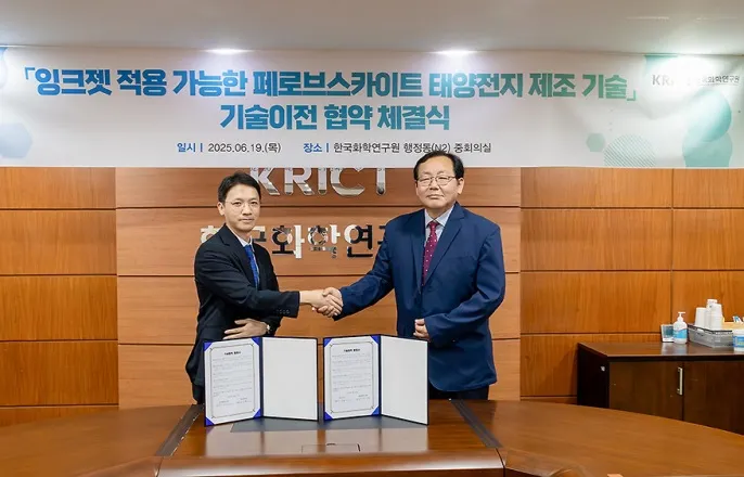 '잉크젯프린팅기반페로브스카이트태양전지'2027년대량생산화학연-고산테크기술이전협약김광수고산테크대표이사(왼쪽)과이영국화학연원장(오른쪽)이기술이전협약후기념촬영을하고있다./사진=한국화학연구원정부가'RE100(재생에너지사용100%)달성'을국정목표로내세운가운데국내연구팀이청정에너지로꼽히는페로브스카이트태양전지대량생산기술을기업에이전해상용화에나선다.19일한국화학연구원(이하화학연)은페로브스카이트대량생산을위한잉크젯프린팅용재료및공정핵심기술을장비전문기업고산테크에이전했다.태양전지는태양빛을전기에너지로전환하는에너지기술이다.무한한태양빛을자원으로활용하는데다발전과정에서유해한물질을배출하지않아청정에너지원으로꼽힌다.페로브스카이트는실리콘을대체할신소재로,유연성과에너지변환효율성이높은게특징이다.다만페로브스카이트태양전지상용화에는한계가있었다.머리카락두께의100분의1수준인매우얇은박막을정밀하게쌓는공정이필요한데,매우정확한두께로균일하게쌓지않으면원하는성능을낼수없다.전남중화학연화학소재연구본부책임연구원연구팀은'잉크젯프린팅'기술로한계를극복했다.페로브스카이트소재의특성을분석해잉크로활용할수있도록점도와표면장력을조절했다.더불어잉크젯의미세분사기술로소재를균일하게정밀코팅할수있는공정제어기술도개발했다.디스플레이제작에주로활용하던고정밀잉크젯프린팅기술을페로브스카이트태양전지제작에접목한것이다.연구팀은이를통해페로브스카이트태양전지의난제였던'대면적화'를손쉽게풀수있을것으로본다.대면적화는차량,건물등다양한분야에활용할수있을만큼충분한면적의태양전지를제작하는것을말한다.전책임연구원연구팀과고산테크는화학연'화학소재부품상생기술협력센터'에입주해공동연구를수행한다.이번기술이전은지난3월센터입주후나온첫번째협력성과다.연구팀과고산테크는'차량용태양광발전(VIPV)'및'건물일체용태양광발전(BIPV)'시스템적용을위한370x470제곱밀리미터(mm²)이상의대면적페로브스카이트태양전지모듈을제작할예정이다.2027년까지대량생산시스템을확보하고2029년부터해외생산라인을구축할계획이다.이영국화학연원장은"화학연의고도화된태양광기술을중소기업과공유한사례"라며"정부의기술사업화정책기조에적극부응하는성과"라고했다.김광수고산테크대표는"상생기술협력센터에서의지속적인협력을통해차세대태양광산업의국제경쟁력을강화하겠다"고했다.한편화학연은신재생에너지분야공동개발등RE100시대에대응할수있는국산에너지기술을확보할계획이다.박건희기자[email protected]©머니투데이&mt.co.kr.무단전재및재배포,AI학습이용금지.