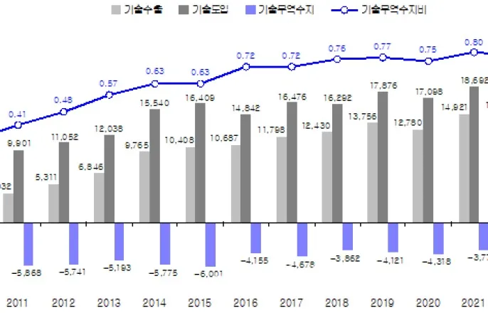 과기정통부,기술무역통계발표2023년기술무역386억달러전기·전자산업37.2%1위차지우리나라의기술무역추이(2010년~2023년).ⓒ과학기술정보통신부2023년우리나라기술무역규모가역대최고인386억달러를기록한것으로나타났다.우리나라가기술을가장많이수출한국가는‘미국’이며,무역수지흑자가가장높은국가는‘중국’으로파악됐다.과학기술정보통신부가29일발표한‘2023년도기술무역통계결과’에따르면2023년도우리나라의기술무역규모(수출+도입)는역대최대규모인386억달러로전년대비37억4700만달러(10.8%↑)증가했다.기술무역수지비(수출/도입)는전년(0.78)대비0.06p상승한0.84로나타났다.기술수출은전년대비16.0%증가한176억4800만달러,기술도입은전년대비6.7%증가한209억5200만달러로모두역대최대규모다.산업별특징을살펴보면,전기·전자산업의기술무역규모가143억7500만달러(37.2%)로전년도1위였던정보·통신산업(124억9100만달러,32.4%)을넘어서가장큰비중을차지했다.기계산업은기술무역규모가23.4%증가했고,건설산업은규모는작지만기술무역수지비가4.56으로가장높았다.전기·전자산업의경우기술수출이52억8300만달러(29.9%)로전년대비28.9%증가해기술수출증가액의약절반(48.8%)을차지했고기술도입은90.9억달러로10.1%가증가했다.전기·전자분야의경우대기업이기술수출및도입증가의주요원인으로분석된다.정보·통신산업은흑자규모가가장큰산업으로기술수출이68억1000만달러(38.6%)로전년대비3.2%증가했고기술도입은56억8000만달러로전년대비4.4%감소해기술무역수지는11억3200만달러흑자를기록했다.기술도입감소는중소기업의기술도입감소(37.5%↓)가주요원인으로분석된다.기관유형별로살펴보면대기업은기술수출증가폭(23.9%↑)이기술도입증가폭(16.3%↑)보다커수지적자가개선됐다.중소기업은기술수출(18.7%↑)은증가,기술도입(23.7%↓)은감소해적자폭이줄어들었다.반면중견기업은기술수출이감소(2.3%↓)하고,도입은증가(8.6%↑)했다.국가별로살펴보면미국이우리나라의최대기술수출국및기술도입국으로조사됐다.기술무역수지흑자규모가가장큰국가는중국인것으로나타났다.미국은기술수출증가량(6억9000만달러,15.4%↑)보다기술도입증가량(12억8000만달러,18.7%↑)이더커기술무역수지적자폭이다소증가했다.대미국기술무역수지적자는2016년부터2020년까지감소해왔으나,2021년부터증감을반복하고있다.중국은전년도흑자규모1위인베트남을넘어2023년기술무역수지흑자규모가가장큰국가로나타났다.전년대비기술수출이증가(7.0%↑)하고기술도입은감소(42.7%↓)하며기술무역수지흑자가증가했다.이는중국전기·전자산업의기술도입감소가주요원인으로분석된다.과기정통부관계자는“기술무역규모의성장세는우리나라의글로벌기술경쟁력이지속적으로성장하고있음을보여주는것”이라며“앞으로도다양한국가와의글로벌협력망구축과함께국가전략기술등핵심기술확보를통한기술이전및사업화까지지원해연구개발(R&D)성과기반의성장생태계를구축해나갈것”이라고말했다.Copyright©데일리안.무단전재및재배포금지.