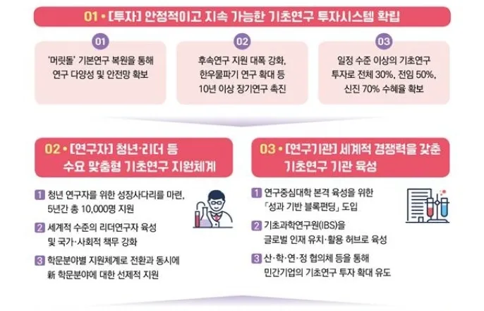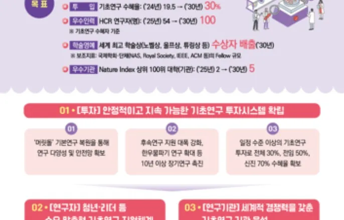 2030년수혜율50%·신진70%목표청년연구자5년간1만명지원기초연구생태계육성방안[과기정통부제공.재판매및DB금지](서울=연합뉴스)조승한기자=정부가기초연구에투자를확대해2030년까지전임교원수혜율50%,신진수혜율70%를확보한다.또5년간박사후연구원과초기교원등청년연구자지원규모를1만명으로확대한다.정부는18일제2회과학기술관계장관회의에서이런내용의'기초연구생태계육성방안'을심의·발표했다.정부는기초연구생태계가투자를통해양적성장하고있지만성과가정체되고연구개발(R&D)예산삭감으로안정성과예측가능성이훼손됐다고진단했다.이를극복하기위해투자시스템,연구자,연구기관,기반측면4대전략및12대과제를설정해2030년까지세계5대기초연구강국을달성하겠다는목표를정부는내세웠다.우선기초연구사업은전체연구자중어느정도비율이수행하고있는지를보여주는수혜율중심으로관리한다.2030년까지전체교원수혜율은30%,전임은50%,신진은70%확보를목표로투자를확대한다.지난해전임수혜율은29%,신진은63%수준으로전임수혜율의경우2배가까운도전적수치로평가된다.또개인연구기간을1~3년에서3~5년으로연장해5년이상과제비율을현행27%에서2030년까지70%이상으로끌어올리기로했다.이를위해정부R&D투자중10%이상이기초연구에투자되도록기초연구진흥법개정도병행하기로했다.박사후연구원과초기교원등청년연구자에대해서는향후5년간1만명이새로운연구자금지원을받을수있도록지원규모를키운다.박사후연구원은이노코어사업등을통해4천명을지원하고초기교원도5년간6천명을신규지원한다는계획이다.최우수연구자가세계최고연구자까지성장하는'톱티어리더연구'를신설하고글로벌파트너십구축도지원한다.최우수석학에대한지원을강화하면서'리더연구자협의체'발족등을통해과학문화활성화,이공계인재양성같은아웃리치(대외활동)도확대하기로했다.과기정통부는이를통해상위1%연구자(HCR)를54명에서2030년100명으로확대하고노벨상등세계최고학술상수상자도배출하겠다는목표를내걸었다.이와함께학문분야별특성과자율성을반영한분야별지원체계로전환해나가고기존에없는새로운학문개척연구지원도강화한다.기초연구생태계기대효과[과기정통부제공.재판매및DB금지]대학에는'성과기반블록펀딩'도입을추진하고선도연구센터자립화등발전방안을마련한다.이블록펀딩을통해전임연구원,연구지원인력,첨단연구시설확충등연구기반투자를유도하고,국가연구소사업의지역트랙도신설한다.기초과학연구원(IBS)을기초과학중추기관으로육성하며기초연구생태계에서민간기업역할확대를위한산학연정협의체구성도추진한다.연구자들의인공지능(AI)접목을위해2030년까지대학에기초연구AI센터40개를지정해운영하고대학AI환경을위한전용인프라구축도병행한다.이를통해과학난제를해결하는기초연구-AI융합연구인력을2030년까지2천명양성한다.배경훈부총리겸과학기술정보통신부장관은"원리를탐구하고지식의토대를축적하는기초연구는우리나라과학기술발전의근간이자미래혁신의출발점"이라며"이번방안을통해연구자들이걱정없이장기·안정적으로창의적인연구를수행하고그가운데세계적성과가지속창출되는기초연구생태계를만들어나가겠다"고밝혔다[email protected]▶제보는카톡okjeboCopyright©연합뉴스.무단전재-재배포,AI학습및활용금지
