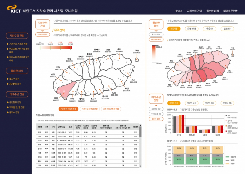 한국건설기술연구원제주도에적용한'KICT해안도서지하수관리시스템'화면/사진=한국건설기술연구원해안지역지하수의변화와염도를실시간으로분석해위험이발생할때마다단계별경고를주는시스템이나왔다.한국건설기술연구원(이하건설연)은수자원하천연구본부연구팀이지역맞춤형해안지역지하수관리를위한웹기반시스템'KICT해안도서지하수관리시스템'을개발했다고6일밝혔다.해안도서지역의물순환정보를분석하고지하수위변동을예측하는시스템이다.지하수는해안지역의농업·산업에쓰이는주요자원이지만기후변화에취약하다.지구온난화로인해해수면이상승하면내륙으로침투하는해수량이많아지는데,이는'염해'의원인이된다.염해는지하수에염분이침투하며농작물이나토양,건축물,시설등에피해를주는것을말한다.염분이많아진지하수는식수나농업용수로사용할수없는데다농작물생육도방해한다.연구팀은해안도서지역에적합한지하수관리시스템을개발했다.관리시스템은국제표준해석기술을적용해△강수량△증발산량△유출량△지하수함양량등물순환정보를제공한다.또지하수의수위변화를예측하는AI(인공지능)기술도접목했다.연구팀은"AI가예측한지하수위와관측수위간상관성정확도는80%이상"이라고설명했다.이밖에도지하수에염분이침투해염해위험이발생할경우위험단계별로예·경보를내린다.연구팀은"기존지하수관리시스템의보완재로서보다정밀한지하수분석이가능해질것"이라며"특히지자체의지하수정보관리시스템과연계할경우지역맞춤형지하수관리데이터베이스를구축할수있다"고했다.김병석건설연원장은"해안지역의염해대응능력을강화하고지하수자원의효율적인관리방안을마련해지역주민의삶의질을높일것"이라고밝혔다.한편이번연구는과학기술정보통신부의지원을받아'신기준수위기반해안지역지하수관리솔루션개발'과제로수행됐다박건희기자[email protected]©머니투데이&mt.co.kr.무단전재및재배포,AI학습이용금지