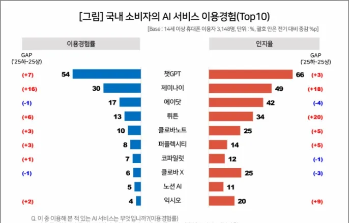 컨슈머인사이트,AI서비스이용률조사제미나이,이용률16%포인트상승개인화기능강화한'뤼튼3.0'출시효과국내소비자4명중3명이평균2.2개의인공지능(AI)서비스를이용해본것으로나타났다.서비스별로는오픈AI의챗GPT가모든지표에서1위로독주하는가운데구글의제미나이와토종서비스뤼튼이빠르게추격하고있다.이동통신전문조사기관컨슈머인사이트는지난10월부터한달간14세이상휴대폰이용자3148명을대상으로AI서비스이용경험을분석한결과를18일공개했다.AI서비스를한번이상이용해본소비자는74%로나타났다.이용빈도는'주3~4회(26%)'가가장많았고,'주1~2회'와'거의매일'이각각23%로동일한비율을나타냈다.이용경험자중72%가일주일에1회이상이용하는셈이다.연령대별로는30대(86%)와20대(83%)의이용경험률이높았고,이어40대·10대(각76%),50대(67%)순이었다.서비스별이용경험률은'챗GPT'(54%)가1위로올해상반기(47%)보다7%포인트상승했다.유일한과반수로독보적인이용자기반을갖춘상태이면서도저변을계속넓혀가고있다.2위는구글의'제미나이'(30%)였다.챗GPT에는아직뒤지지만돋보이는상승세(+16%포인트)로반년만에2배로늘어났다.국산서비스로는'에이닷'(17%)과'뤼튼'(13%)이3,4위로선전했다.에이닷은상반기대비이용경험률이주춤하며(-1%포인트)제미나이에밀려한계단내려앉은반면뤼튼(+6%포인트)은같은기간한계단올라섰다.뤼튼의상승세에는AI검색과생산성보조기능,'나만의AI'등개인화기능을강화한'뤼튼3.0'출시효과가컸다.이어'클로바노트'(10%)가두자릿수로5위를기록했고,'퍼플렉시티'(8%),'코파일럿'(7%),'클로바X'(6%),'노션AI'(5%),'익시오'(4%)순으로톱10에이름을올렸다.챗GPT는인지율('이름을들어봤거나알고있다'비율)에서도66%로단독1위를지켰고,2위제미나이(49%)는큰폭의상승세(+18%포안트)로선두를추격하고있다.3위에이닷(42%)이소폭하락한반면뤼튼(34%)이큰폭으로상승(+20%포인트)해4위에올라선점도이용경험률과비슷했다.이용자체감만족률역시챗GPT(68%)가단독선두로,공동2위인제미나이·익시오·퍼플렉시티(각각59%)를큰차이로앞섰다.컨슈머인사이트관계자는"챗GPT는모든소비자지표에서여전히압도적이지만안주할상황은아니다"라며"6개월만에이용경험률2배가된제미나이의약진이나뤼튼의성장속도를고려하면시장판도변화는시간문제"라고분석했다.이어"클로바X등국내소비자에게익숙한토종서비스의저력,기업시장에강한MS코파일럿의시장확대등변수도많아시장재편의가능성은열려있다"고덧붙였다.김보경기자[email protected]©아시아경제.무단전재및재배포금지.