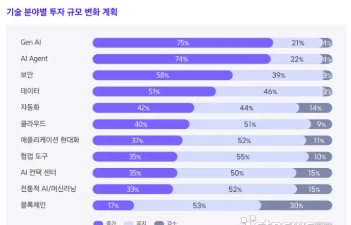[사진=삼성SDS제공]올해국내기업10곳중7곳이상이'AI에이전트'투자를대폭확대할전망이다.AI도입이시범단계를넘어생존을위한필수전략으로자리잡았다는분석이다.삼성SDS는이같은내용을담은'2026년국내기업IT투자전망'보고서를발표했다.이번조사는국내주요대기업과중견기업최고경영진(C-레벨),IT담당임원600여명을대상으로진행됐다.전체응답기업의74%는올해'AI에이전트'투자를전년대비늘리겠다고답했다.이는생성형AI투자확대응답(75%)과맞먹는수치다.AI기술트렌드가텍스트생성을넘어자율적으로업무를수행하는에이전트단계로빠르게진화하고있음을보여준다.가장주목할점은경영환경전망과IT투자의'디커플링(탈동조화)'현상이다.올해경영환경이전년과비슷하거나나빠질것으로내다본기업군을별도분석한결과,생성형AI와AI에이전트투자를늘리겠다는응답이각각70%에달했다.기업들이당장의경기위축보다기술혁신에뒤처지는것을더큰위험으로판단한결과다.AI투자는보안과데이터인프라시장성장도견인한다.생성형AI투자를늘리는기업의67%는보안투자를,63%는데이터투자를함께확대할계획이다.AI에이전트활용을위해선데이터품질확보와보안위협대응이필수적이기때문이다.AI투자와맞물려전체적인IT투자심리도회복세다.올해IT투자규모를늘리겠다는기업은33%로지난해조사대비8%포인트(P)상승했다.투자를유지하겠다는응답(52%)을합치면기업85%가IT예산을지난해와같게유지하거나증액한다.산업별로는금융권이가장적극적이다.금융기업의47%가IT투자규모를늘리겠다고답해전체산업평균(33%)을크게웃돌았다.반면에유통·리테일업계는소비심리위축(57%)을,제조업계는국제정세불확실성을최대리스크로꼽으며상대적으로신중한모습을보였다.기업들이꼽은사업수행최대장애요소는'시장및기술의급격한변화(47%)'였다.이는경제성장둔화(40%)나원가상승(35%)보다높은수치로,급변하는기술트렌드대응이기업의최우선과제임을시사한다.삼성SDS관계자는“생성형AI와AI에이전트투자는기업IT투자규모의증감여부와관계없이지속해증가하는양상을보인다”며“기업들이AI를통해조직의잠재력을극대화하고혁신을가속하도록적극지원하겠다”고말했다.류태웅기자[email protected]©전자신문.무단전재및재배포금지.
