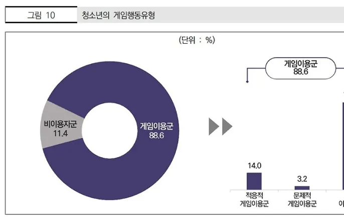 게임이용률88.6%,비이용자42%도게임방송시청콘텐츠진흥원2025아동청소년조사국내청소년의게임행동유형['2025아동청소년게임행동종합실태조사'보고서내용중](서울=연합뉴스)김주환기자=국내초·중·고교생89%는게임을즐기며,게임을하지않는학생42%가량도일주일에한번이상게임방송을시청하는것으로나타났다.한국콘텐츠진흥원은6일전국아동·청소년및보호자1만9천명을대상으로비디오게임이용행태를조사한'2025아동청소년게임행동종합실태조사'보고서를공개했다.진흥원에따르면전체청소년(초등학교4∼6학년및중고교생)중게임을이용하는게임이용군은88.6%,비이용자군은11.4%로나타났다.비이용자군비율은2022년17.3%,2023년13.6%,2024년12.5%등으로지속적인감소세를보였다.게임을긍정적으로활용하는적응적게임이용군비율은14%로전년대비1.6%p증가했고,일상생활에부정적영향을미칠정도로이용하는문제적게임이용군비율도3.2%로0.2%p늘었다.청소년의게임관련방송시청정도['2025아동청소년게임행동종합실태조사'보고서내용중]비이용자군비율은남학생5.7%,여학생17.3%로크게차이가났으며,초등학교(7.1%)에서중학교(11.2%),고등학교(15.7%)로올라갈수록높아지는경향을보였다.청소년이한달에지출하는게임비용은'전혀쓰지않는다'는응답이66.3%로가장높았다.문제적게임이용군의경우'5만원이상'지출한다는응답이18.2%로적응적게임이용군(3.4%)와일반이용자군(3.9%)에비해매우많았다.통계에는게임관련인터넷방송시청률도포함됐다.게임이용청소년의경우모든유형에서게임관련방송을'거의매일'시청한다는응답이가장높게나타났다.거의매일시청하는비율의경우문제적게임이용군에서68%로높게나타나적응적게임이용군(37.5%),일반이용자군(44.4%)대비큰차이를보였다.게임을전혀하지않는비이용자군또한42.2%는일주일에최소한하루이상은게임방송을즐기는것으로나타났다.아동(초등학교1∼3학년)보호자의게임이용률은54.8%로절반이상의부모가평소게임을즐기는것으로조사됐다.적응적게임이용군부모의경우가끔이용한다(45.6%)라고답한비중이가장컸지만문제적게임이용군부모는38.6%가'자주이용한다',18.5%가'언제나이용한다'고답했다.반면비이용자군아동부모는게임을'전혀하지않는다'는응답이83.3%로,부모의이용행태에영향을받는경향을보였다.아동의게임행동유형과보호자의게임이용정도간관계['2025아동청소년게임행동종합실태조사'보고서내용중]연구진은결론에서아동·청소년의게임이용에대한부모의역할과관심을강조했다.연구진은"초등학교시기에는보호자가자녀의게임이용을세밀하게살피고분명한이용규칙을제시할때자녀의게임조절역량이높아지는경향이관찰됐다"라며"중·고등학생시기에는직접적인규제보다는자녀의게임이용에대한인지적관심과정서적이해가보다중요하게나타났다"라고설명했다.그러면서"평소게임을주제로자녀와원활하게대화가통하는경우,자녀가게임이용을넘어정보기술(IT)분야로관심을확장하는경향도함께나타났다"라고설명했다.게임리터러시교육에서게임비용조절문제에대해서도함께강조해야한다고제언했다.연구진은"게임을하면서도무조건결제를하거나인앱구매를하는방식이아니라자신이스스로비용을조절하는방법을익힐수있도록돕는교육이절실하다"라고설명했다.이어"게임을개발하는산업체도아동이나청소년에게과도하게인앱구매를유도하거나홍보하는전략을취하지않도록산업체내에서스스로자성하는것도필요하다"라고업계의노력도강조했다.2025아동청소년게임행동종합실태조사[한국콘텐츠진흥원제공]그러면서"최근에보면이벤트등을통해슬롯머신이나확률형게임을제공하는경우가급증하고있는데,아동·청소년에게는이러한방식이아닌대안적인이벤트를제공하려는노력또한필요하다"고덧붙였다[email protected]▶제보는카톡okjeboCopyright©연합뉴스.무단전재-재배포,AI학습및활용금지