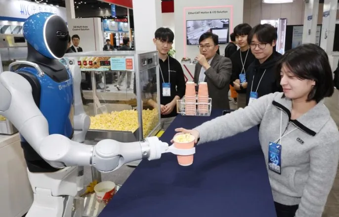 '2025로보월드'가5일경기고양시킨텍스제1전시장1~2홀에서열린가운데뉴로메카휴머노이드로봇이팝콘을담아주고있다.사진=박범준기자#.사람이종이컵을내밀자로봇이이를인지하고팔을움직였다.로봇은컵을받아이동한뒤팝콘을담아다시사람에게건네주는모습을연출했다.뉴로메카가만든휠(wheel)기반휴머노이드다.하체부분엔바퀴가달려신속하고정교하게이동할수있고,상체는사람처럼인지하고움직인다.속도만좀더붙으면영화관에서팝콘을서빙하는직원의업무를로봇이완전히대체할수있겠다는생각이들정도였다.5일경기고양시킨텍스제1전시장1~2홀에서열린‘2025로보월드’현장에서는휴머노이드로봇,인공지능(AI)로봇,자율주행·물류로봇등차세대기술과솔루션을한눈에확인할수있었다.특히휴머노이드로봇의가능성을볼수있는자리였다.뉴로메카는서비스형휴머노이드로봇‘나미’를활용한팝콘제공서비스를선보였다.시연은단순동작제어를넘어실제서비스현장에서자연스러운사용자응대와안전성확보에초점을맞췄다.로봇이주는팝콘을먹기위해기다리는사람들도긴줄이늘어섰고곳곳에서로봇의팝콘서빙모습을휴대전화로찍는소리가들렸다.뉴로메카는전시장중앙부에오픈형부스를마련해나미와함께휴머노이드에최적화된초경량액추에이터,초경량협동로봇옵티3,30kg급고가반하중로봇누리30,AI기반2세대협동로봇의충돌회피기술등을전시했다.신규협동로봇플랫폼으로는‘세계최경량가반하중3kg급협동로봇옵티3’를공개했다.뉴로메카관계자는“소형경량협동로봇의표준을제시함과동시에산업현장에서의안전·정밀작업혁신을직접체감할수있게구성했다”고말했다.■스스로판단하는로봇부터요리로봇까지에이로봇부스에서도눈길을끈것은휴머노이드로봇‘앨리스4’였다.휴머노이드로봇'앨리스4'가뒤집힌컵안에주사위2개를넣고흔든다.나온눈의합은8이었다.로봇맞은편에관람객이던진주사위눈의합은7.주사위대결승리를인식한앨리스4는"제승리입니다"라며"한번더해볼까요?"라고말했다.재대결에서관람객이승리하자"당신의승리를축하합니다"라고인사를건넸다.이어"시원한물한잔드릴게요"라며옆에놓인생수를손으로집어관람객에게전달했다.에이로봇한재권최고기술책임자(CTO)는"앨리스4는스스로판단하고행동하도록거대언어모델(LLM)이탑재돼사람과자연스럽게소통할수있다"고말했다.에이로봇이선보인반려로봇'에디'도어린이들의관심을독차지했다.에디외형은부드러운흰색털로덮혀양을연상케했다.주변환경을인식해마치강아지처럼사람이움직이는대로함께따라왔다.머리를쓰다듬으면화면이웃는얼굴로바뀌고,볼을만지면눈이'하트'모양으로변했다.뒤뚱거리거나빠르게주행하는등다양한버전으로로봇과소통이가능했다.'2025로보월드'가5일경기고양시킨텍스제1전시장1~2홀에서열린가운데참가자들이휴머노이드복싱경기를살펴보고있다.사진=박범준기자코라스로보틱스는이용자음성을인식해요리를하는로봇을선보였다.테이블에설치된마이크에"케첩"이라고말하자로봇팔이움직여소스통을꾹누르며케첩을짰다.사람손과비슷한'그리퍼'를상황에맞춰바꿔끼면음식재료가담긴그릇을집어튀김기에넣고튀김을조리하거나부서지기쉬운과자를손쉽게옮기기도했다.모션컨트롤전문삼현은국내최초‘고하중자율주행로봇(HAMR)’양산형모델을공개했다.기존무인운반차량(AGV)최대속도가시간당5㎞인것과달리최대20km고속주행이가능한게특징이다.중국기업유니트리로보틱스와국내파트너사인로아스부스에서는‘휴머노이드G1’2기가복싱으로맞붙어관객들의시선을사로잡았다.두로봇은헤드기어와권투장갑을착용한채링위에올랐다.인간심판의경기개시선언과함께경기가시작되자마자로봇들은서로를향해주먹을내지르고가드를올렸다.사람의동작을보는듯한싸움이이어지면서둔탁한타격음이순식간에장내를채웠다.'2025로보월드'가5일경기고양시킨텍스제1전시장1~2홀에서열린가운데참가자들이한국기계연구원의휴머노이드로봇을살펴보고있다.사진=박범준기자■피지컬AI로봇에웨어러블로봇시연눈길산업현장의업무효율을높이는솔루션을제공하는제조로봇기업들도전시에나섰다.이들은AI나자율주행등최첨단기술을접목해제조혁신에앞장서고있다.유진로봇의피지컬AI로봇에사람이음성으로"리모콘을테이블에놓아줘"라고부탁하면로봇이사용자의요청과맥락을이해해수행에나선다.로봇은약2m거리를이동해테이블위에놓인물건중리모콘만정확히인식해집어갔다.유진로봇관계자는"피지컬인공지능이머리속에서생각하는단계를넘어현실에서물리적인행동이가능하다"고설명했다.로봇기업브릴스전시장에는크기에따른10가지유형의6축협동로봇이일제히관절을꺾으며움직이고있었다.브릴스의협동로봇은인간작업자와협력해소규모생산라인부터대규모산업현장까지쓸수있다.이밖에나우로보틱스,티로보틱스등각종기업들이반복작업을효율화하고전문지식없이도공정이나물류자동화가가능한산업용로봇들을선보였다.한국기계연구원은근로자를보호하는로봇기술을이용한웨어러블로봇(근력보조슈트)시연을선보였다.163cm의마른체격의여성시연