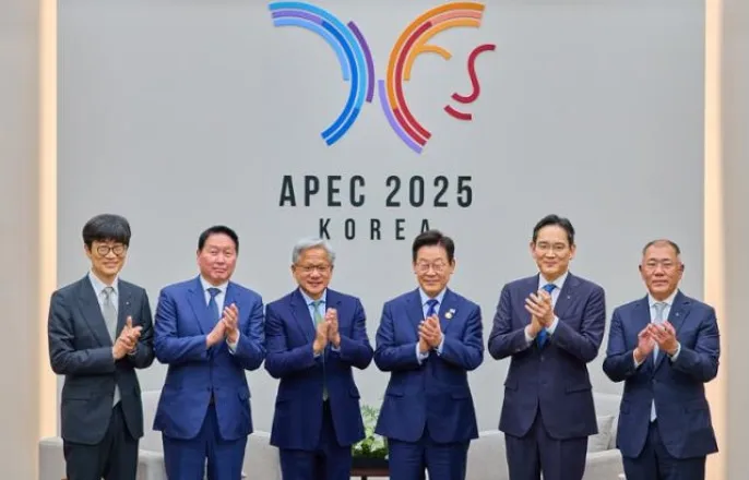 이재명대통령-젠슨황엔비디아CEO회동배석한이재용삼성전자회장·최태원SK그룹회장정의선현대차그룹회장·이해진네이버의장이재명대통령이31일경북경주화백컨벤션센터에서젠슨황엔비디아최고경영자(CEO)접견에앞서참석자들과기념촬영을하고있다.왼쪽부터이해진네이버의장,최태원SK그룹회장,젠슨황엔비디아최고경영자(CEO),이대통령,이재용삼성전자회장,정의선현대차그룹회장.대통령실제공이재명대통령과젠슨황엔비디아최고경영자(CEO),국내인공지능(AI)을이끄는4대기업총수인이재용삼성전자회장과최태원SK그룹회장,정의선현대차그룹회장,이해진네이버이사회의장이모인자리에서는웃음소리가끊이지않았다.엔비디아가한국정부와이들네그룹에에26만장의최신그래픽처리장치(GPU)를투입하며한국이AI3대강국이라는꿈에한걸음다가가면서참석자들은엔비디아와인연을떠올리고AI발전청사진을쏟아냈다.이대통령이'치맥회동'을언급하며"그자리에있었어야했다"고말하자황CEO는"모두들으셨냐.다음엔함께하시자"고화답했다.이재용회장"젠슨이시켜서골든벨도"이재명대통령이10월31일경북경주화백컨벤션센터에서열린젠슨황엔비디아최고경영자(CEO)접견장에서이재용삼성전자회장과인사를하고있다.경주=왕태석선임기자10월31일2025아시아태평양경제협력체(APEC)정상회담이열린경북경주화백컨벤션센터에서이회장은황CEO를'젠슨'이라부르며오랜유대관계를강조했다.이회장은"삼성과엔비디아는25년넘게함께일해왔고(황CEO와의)둘관계도20년이넘어친구관계도더가까워졌다"며"어제치맥도했고젠슨이시켜서생전처음골든벨도쳤다"고말했다.이회장은이어"삼성은엔비디아와함께생성형AI는물론디지털트윈,AI팩토리·로보틱스,6GAI통신네트워크,AI기반반도체노광등을혁신해나가겠다"며"신약개발플랫폼,슈퍼컴퓨터등다양한분야로협력을확대해나가글로벌패러다임을선도하는강국이되도록노력하겠다"고말했다.이회장은또"(황CEO의)따님메디슨이옴니버스를담당하고있다"며남다른친분도뽐냈다.옴니버스는엔비디아가개발한3D시뮬레이션플랫폼으로현실의공장,도시,인프라를디지털트윈으로복제하는기술이다.최태원회장"엔비디아'옴니버스'로제조업AI혁신플랫폼만들어공유할것"젠슨황엔비디아CEO가10월31일경북경주시경주예술의전당에서열린아시아태평양경제협력체(APEC)CEO서밋에참석해최태원SK그룹회장겸대한상의회장과만나AI슈퍼컴퓨터DGX스파크를선물하고있다.경주=공동취재단최회장은"(엔비디아와SK는)오랜기간관계를유지했고최고의파트너로서함께AI발전을위해노력하고있다"고했다.이어"제조AI플랫폼에는옴니버스툴이필요하다"며"이를도입해서디지털트윈을구현하고제조업을AI로혁신할수있는플랫폼을만들고자한다"고밝혔다.그는이어"이플랫폼은SK만쓰는것이아니라공공부문과스타트업도함께사용할수있게끔제공할예정"이라며"우리나라제조AI얼라이언스형태를잘만들어서우리제조업이세계를리딩할수있도록기술축적이필요하다"고말했다.이어"스타트업얼라이언스와데이터풀링,인센티브제도도입으로스타트업들이제조·AI에활발히진입할수있게해달라"고이대통령에게건의했다.정의선회장"엔비디아와30억달러공동투자...피지컬AI센터설립추진"정의선현대차그룹회장이10월31일APEC정상회의장소인경북경주화백컨벤션센터에서이재명대통령과젠슨황엔비디아최고경영자(CEO)접견에서발언하고있다.경주=대통령실통신사진기자단정회장은"15년전에모터쇼와CES에서황CEO를만났는데게임과자동차에들어가는칩활용에대해얘기를나눴다"고전했다.그는"1월엔비디아와전략적파트너십을맺고제조디지털트윈,자율주행,AI인프라등포괄적협력을진행중"이라며"자율주행및미래모빌리티,AI기반공장자동화(스마트팩토리),자율주행로봇용온디바이스반도체공동개발을추진하고있다"고말했다.정회장은"현대차그룹은방대한데이터와스마트제조역량을보유하고있어피지컬AI개발뿐아니라AI기반미래모빌리티설루션을제공할수있는최적의기업"이라며"엔비디아와30억달러공동투자로국내AI테크놀로지센터·피지컬AI애플리케이션센터설립도추진하려한다"고설명했다.피지컬AI는단순자동화를넘어센서·로봇·사물인터넷(IoT)등현실기기와데이터를연결해작업자안전확보,불량방지,생산성극대화를지원한다.옴니버스로대표되는디지털트윈과피지컬AI가결합되면AI모델이설비없이도가상공간과연동돼테스트할수있다.이를통하면AI적용속도와신뢰도를크게높일수있다는게업계의분석이다.이해진의장"엔비디아서버대신주식샀으면"농담도...글로벌협력강화강조이해진네이버이사회의장이10월31일APEC정상회의장인경주화백컨벤션센터에서진행된이재명대통령과젠슨황엔비디아최고경영자의면담에참석해발언하고있다.경주=연합뉴스이의장은"저희는엔비디아GPU를아주초기에도입해서버팜을구축했으며세계에서세번째로대규모언어모델(LLM)모델을만들었다"고강조했다."황CEO에게하는농담이있는데'그때서버대신엔비디아주식을샀으면더좋았을것같다'는말을하기도했다"며웃었다.이의장은천년고도경주를언급하며"500년,1,000년후에는각국의데이터와AI가새로