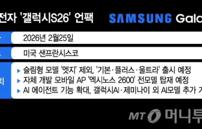 기본·플러스·울트라3종유지애플아이폰17성능의약6배'엑시노스2600'전모델탑재삼성전자'갤럭시S26'언팩/그래픽=김지영삼성전자가내년2월말에미국샌프란시스코에서'갤럭시언팩'(GalaxyUnpacked)을연다.3일업계에따르면삼성전자는내년2월25일샌프란시스코에서차세대플래그십스마트폰'갤럭시S26'(이하갤S26)시리즈공개를확정하고관련준비작업에착수했다.삼성전자소식에정통한관계자는"삼성이2023년갤S23이후3년만에샌프란시스코언팩을준비중"이라며"샌프란시스코가AI(인공지능)기술의중심지로부상한만큼'AI스마트폰'시대를연삼성이행사를열기엔최적의장소"라고말했다.삼성은주로1월말~2월초에언팩을진행했지만이번엔2월말로일정을조정했다.업계에선제품라인업조정이영향을미쳤다는분석이나온다.삼성은당초갤S26시리즈부터기본모델을'프로'로바꾸고플러스대신'엣지'모델을도입할계획이었으나전작인갤S25엣지의부진으로'기본·플러스·울트라'3종체계를유지키로했다.이번갤S26시리즈엔반도체(DS)부문시스템LSI사업부가개발한차세대모바일AP(애플리케이션프로세서)'엑시노스2600'이전량탑재될전망이다.최상위모델인울트라에도엑시노스칩이들어가는것은'갤S22'이후4년만이다.AP는스마트폰의'두뇌'로불리는핵심부품으로제품의성능을좌우한다는점에서삼성의기술자신감이반영됐다는평가가나온다.IT(정보기술)팁스터(정보유출자)'주칸'에따르면엑시노스2600은벤치마크사이트긱벤치테스트에서싱글코어3455점,멀티코어1만1621점을기록했다.지금까지공개된엑시노스테스트중가장높은점수다.애플'아이폰17'시리즈에탑재된'A19프로'보다성능이우수하다는평가도있다.삼성내부의테스트결과엑시노스2600은A19프로대비△NPU(신경망처리장치)성능약6배△CPU(중앙처리장치)멀티코어성능14%△GPU(그래픽처리장치)성능최대75%높은것으로전해졌다.다만IT매체샘모바일은"퀄컴의'스냅드래곤8엘리트젠5(Gen5)'가싱글코어3832점,멀티코어1만2170점을기록해여전히한발앞선다"고했다.삼성은갤S26으로'AI스마트폰'경쟁에서확실한승기를잡겠다는포부다.삼성의'갤럭시AI',구글의'제미나이'외AI에이전트가추가될가능성도제기된다.삼성전자관계자는실적발표에서엑시노스2600의갤S26적용여부에대해"AP평가를진행중이고확정하기어렵다"고밝혔다.이어"더많은앱을AI에이전트로통합해갤럭시기기전반의AI활용을확대하겠다"고말했다.윤지혜기자[email protected]©머니투데이&mt.co.kr.무단전재및재배포,AI학습이용금지.