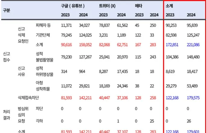 유튜브·X·메타신고급증…도박·불법식의약품심의적체도심각2023-2024불법촬영물등신고,삭제요청,내용처리결과ⓒ최수진의원실불법촬영물신고가40만건에육박하는가운데,심의적체로피해구제가지연되고있다는지적이제기됐다.31일국민의힘최수진의원이방송미디어통신위원회에서제출받은자료를분석한결과,지난2년간불법촬영물관련신고·삭제요청건은39만3937건,삭제·접속차단조치는30만1743건에달하는것으로나타났다.주요해외사업자중구글(유튜브)은2023년9만616건,2024년15만8052건으로75%이상급증했다.트위터(X)는2023년과2024년각각8만2068건,6만2751건이었고,메타는2023년167건,2024년283건의신고를접수했다.신고사유별로는성적불법촬영물이2023년과2024년각각10만4386건,14만8480건으로가장많았다.아동·청소년성착취물은2023년2만9279건,2024년에는5만3489건이었으며성적허위영상물은2023년8619건에서2024년1만8417건으로2배이상늘었다.신고·삭제요청주체별로는2023년피해자등이신고한사례가9만253건,기관·단체가요청한수가8만2598건이었으나2024년에는피해자등이신고한사례9만5839건,기관·단체가신고한사례가12만5247건으로늘었다.방미통위는신고대비삭제·차단건수의차이에대해중복신고와불법촬영물미해당,이미삭제된사례가포함된결과라고설명했다.삭제·차단비율은2023년70.67%에서2024년81.22%로상승,조치효율은전년보다개선된것으로나타났다.불법촬영물은‘성폭력범죄의처벌등에관한특례법’에따른촬영물,복제물,편집물,합성물,가공물,‘아동·청소년성보호에관한법률’에따른아동·청소년성착취물등을말한다.정보통신망법개정에따라2021년부터구글,트위터,메타등국내외인터넷사업자들은투명성보고서를공개하고있으며,불법촬영물신고·삭제·차단현황및기술적·관리적조치내역등유통방지를위한법정의무사항을담고있다.각사업자들은이미삭제처리되거나,정보가불충분하거나콘텐츠를찾지못하는경우를제외하고삭제접속차단등의신고처리를하고있다.다만현재사업자별통계작성기준과양식이달라수치편차가발생하고,게시자자진삭제건은집계가어려운한계가있다.이외에도방미통위는각사업자에신고1건당신고사유1건으로처리하도록요청하고있으나,중복사유건이완전히구분되지않아통계의정확성제고가요구되는상황이다.플랫폼내불법촬영물관련조치외에도,방송미디어통신심의위원회가수행하는통신심의건수도매년급증하고있다.도박,불법식·의약품,음란·성매매등다양한사유로차단·삭제요청이쏟아지고있으나,심의인력은10년넘게사실상제자리다.방송미디어통신심의위원회자료에따르면,통신심의건수는2008년2만9000건에서2024년35만6000건으로12배늘었으나심의인력은21명에서43명으로2배증가하는데그쳤다.2025년10월기준심의대기건수만16만8000건으로,▲도박관련6만7000건▲불법식·의약품1만건▲음란·성매매2만7000건등불법촬영물외에도도박·식의약품·사기성콘텐츠등국민피해와사회적부작용이큰심의가적체돼심의지연이불가피한실정이다.최수진의원은“플랫폼의투명성보고서의무를형식적인공개수준에그치지않고실질적관리·감독기준으로강화해야한다”며“불법촬영물뿐아니라도박,불법식의약품,성매매등다양한불법정보가폭증하는상황에서심의자동화·AI탐지강화·해외사업자제재근거마련이시급하다”고밝혔다.최의원은“국민피해가몇달씩지연되는현실을개선하기위해신속조치체계구축과임시조치제도확대를검토해야한다”고덧붙였다.Copyright©데일리안.무단전재및재배포금지.
