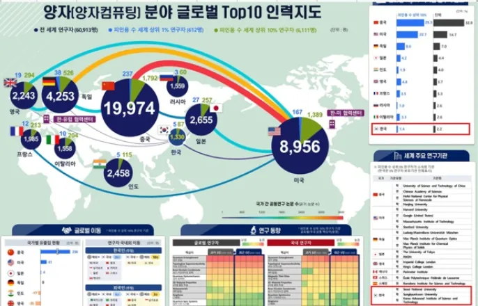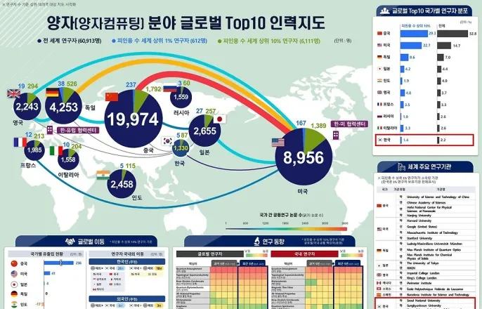 과기정통부,제22회미래인재특별위원회개최국가전략기술글로벌인력지도분석안심의·의결논문피인용기준양자컴퓨팅부문글로벌인력지도./과학기술정보통신부과학기술정보통신부가발표한분석에따르면한국은양자컴퓨팅분야에서세계10위,양자통신과센싱분야에서는12위수준의핵심연구인력을보유한것으로나타났다.30일과기정통부는제22회미래인재특별위원회를열고이같은내용을담은‘국가전략기술글로벌인력지도분석안’을심의·의결했다고밝혔다.이번인력지도는관련논문데이터를기반으로각국핵심인재의분포와연구협력추세를종합적으로분석한첫결과물이다.분석결과,전세계양자연구생태계는미국과중국이주도하고있는것으로확인됐다.두국가는모든양자중점기술분야에서가장많은연구자를보유하고있으며,논문피인용수상위10%에속하는핵심연구자중절반이상을차지했다.상위1%연구자의비중은이보다도높았다.국가별로보면,미국은구글·IBM등산업계중심으로핵심인재가포진했고,중국과유럽은연구기관에다수가집중됐다.한국의경우학계중심의연구자구성이두드러졌다.최근10년간국가간연구자이동을분석한결과,미국과중국은모든양자분야에서연구인력이꾸준히유입된순유입국으로나타났다.한국역시순유입국으로분류됐으며,양자컴퓨팅21명,양자통신10명,양자센싱16명이순유입된것으로조사됐다.주요유입국가는미국,싱가포르,중국등이다.또한국은기관내부협력은감소했지만,기관간국내협력과국제공동연구는오히려늘어난것으로나타났다.이날회의에서는인공지능(AI)분야인재수요분석결과도함께논의됐다.분석에따르면,AI관련채용공고는2017~2018년연500여건수준이었으나,2022년말챗GPT등장이후급격히늘어나2024년8월기준2000건을돌파했다.직무별로는AI응용·개발분야가전체의42.9%를차지했으며,대기업과중견기업은데이터설계·분석,AI전략및기획인력을,중소기업은AI특화모델개발인력을주로찾는것으로나타났다.경력직선호도는2020년54%에서2024년80.6%로크게증가했다.요구기술1위는전기간에걸쳐‘파이선(Python)’이었다.과기정통부는이번분석결과를국가전략기술관련사업과예산배분,정책수립등에적극반영할계획이다.민간에서도연구개발및인재확보전략수립에참고할수있도록결과를공개한다.박인규과기정통부과학기술혁신본부장은“정부는앞으로도국가전략기술전분야로글로벌핵심연구자DB구축을확대해효과적으로연구개발(R&D)네트워크를구축하고협력기반을마련할것”이라며“실제현장으로부터수집된인재데이터에대한정확한분석을바탕으로국민체감도높은과학기술정책을수립해나갈것”이라고말했다.-Copyrightⓒ조선비즈&Chosun.com-Copyright©조선비즈.무단전재및재배포금지.