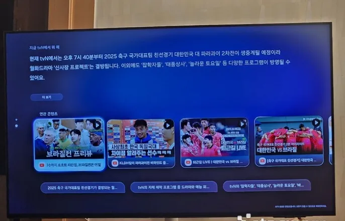 실시간방송보다OTT나유튜브를즐겨찾는시대지만내기분과취향에맞는콘텐츠를찾는과정은다소귀찮다.공중파나수많은케이블TV채널에서내가좋아하는예능이나드라마를방송하고있는지편성표를뒤지는것도번거롭다.삼성전자의'비전AI컴패니언(VAC)'을삼성'더무빙스타일'과결합한42형삼성OLEDTV에서약2주간사용해보니콘텐츠를간편하게즐길수있게해주는꽤괜찮은서비스라는생각이들었다.삼성비전AI컴패니언으로'지금tvN에서뭐해'라고물으니편성표정보와관련콘텐츠를추천해줬다.(사진=배옥진)특히음성인식검색결과가상당히만족스러워콘텐츠이용패턴을확바꿔놨다.'있으면좋지만없어도상관없는'수준이아닌,비전AI컴패니언이없는TV로다시돌아가기싫다고느껴질정도였다.가장만족스러운기능은채널추천이었다.최근재미있게보는'신인감독김연경'을보기위해리모컨마이크버튼을누르고음성인식을하자,유튜브·웨이브등에서제공하는관련공식콘텐츠는물론해당프로그램을소재로한개인유튜브와김연경선수가과거출연한방송프로그램까지추천했다.프로그램기본정보는물론가장최근회차의내용까지상세하게음성으로설명해줬다.음성인식성능도상당히만족스럽다.삼성전자는가정내다양한소음환경을고려해리모컨에마이크기능을내장했다.리모컨앞부분을가까이대고말하면빅스비가명령을수행한다.설정에따라리모컨을이용하지않고도빅스비를이용할수있다.인식률은거의100%다.'신인감독김현경'으로인식한직후바로'신인감독김연경'으로스스로인식단어를바꿔검색했다.'도시어부보여줘'라고명령하자'도시허브'로인식한직후빠르게'도시어부'로바꿔냈다.음성인식성공률때문에스트레스를받는일은사용기간내내거의없었다.도시어부를시청하면서“저기나온여행지알려줘”라고하니관련지역정보를제공했다.정보가충분하지않을때는해당프로그램이주로촬영하는지역을알려주기도했다.삼성비전AI컴패니언은실시간AI번역기능도제공한다.현재는지상파·케이블·위성방송프로그램에서만AI번역기능이활성화된다.OTT방식이나HDMI방식으로시청하는영상은아직지원하지않는다.TV를보다가스마트폰으로따로검색할필요없이퍼플렉시티같은생성형AI서비스를바로이용할수도있다.삼성전자의42형OLEDTV를더무빙스타일에결합한모습.바퀴가달려있어거실,방,주방등다양한장소로손쉽게이동시킬수있다.비전AI컴패니언의음성인식기능의편리함을더극대화해준다.(사진=배옥진)리모컨의수많은기능버튼을찾을필요없이음성인식으로TV기능을조정하는것도수월했다.기본적으로주변환경소음에따라AI가음량을자동설정한다.“음량낮춰”라고명령하니음량레벨을8에서6으로조정했다.“고양이가자고있으니좀조용하게해줘”라고하니“그럼얼마나조용하게하면될까요?”라고물으며음량조정버튼을활성화했다.삼성전자의비전AI컴패니언은무빙스타일과결합할때강점이더극대화됐다.TV를안방으로가져와침대에누워보기편안한각도로시청하니편안함과여유로움으로만족도가높았다.리모컨음성인식으로원하는콘텐츠를마음껏검색할수있어편안함이배가됐다.OLEDTV는화면빛반사가없어어느각도로TV를놔도콘텐츠를온전히즐기기에좋았다.배옥진기자[email protected]©전자신문.무단전재및재배포금지.