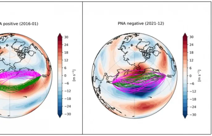 한국기상학회서연구결과발표…"최대1시간차이"양(+)의태평양-북미패턴(PNA)위상이나타난2016년1월(왼쪽)과음(-)의PNA위상이나타난2021년12월(오른쪽)에서의최적비행경로공간분포.초록색은동편향최적경로이고보라색은서편향최적경로.한국기상학회제공북태평양을가로지르는항공기의비행시간은'기후변동현상'의영향을받는다는연구결과가나왔다.한국기상학회는김정훈서울대지구환경과학부교수연구팀이대규모기후변동현상이제트기류의위치와강도에영향을미쳐북태평양을횡단하는항공기의비행시간을바꿀수있다는점을확인했다고29일밝혔다.연구결과는11월4~7일창원컨벤션센터(CECO)에서열리는‘2025년한국기상학회가을학술대회’에서발표될예정이다.항공사들은효율적이고안전한운항을위해상층대기의기상에맞춰비행경로를최적화한다.순풍이부는지역으로이동하고난류와같은위험기상이나타나는지역은회피하도록계획한다.특히상층제트기류를잘활용하면비행시간과연료소모를줄일수있다.제트기류는대류권상부나성층권하부에수평으로좁고길게나타나는강한기류다.연구팀은1979~2022년유럽중기예보센터(ECMWF)재분석자료(ERA5)를활용해엘니뇨-남방진동(ENSO),북극진동(AO),태평양-북미패턴(PNA)등북태평양지역에서나타나는대규모기후변동현상이제트기류의위치와강도에영향을준다는점을확인했다.ENSO,AO,PNA와북태평양횡단비행시간간의관계를분석한결과비행시간은기후변동현상과강한계절적연관성을보였다.특히북태평양과북미대륙의대기순환변동을설명하는기후패턴인PNA는도쿄-LA항로의겨울철월평균왕복비행시간차이에약60%기여하는요인이라는점이확인됐다.PNA위상에따라가장빠른비행시간과가장느린시간이43~61분의차이가발생하는것으로나타났다.PNA위상은양(+)의위상과음(-)의위상으로나뉜다.양의위상은PNA의패턴이평소보다강하게나타났다는의미이고음의위상은반대방향으로뒤집힌상태를의미한다.PNA가양의위상이면서쪽에서동쪽으로부는바람인편서풍이저위도에서는강화되고고위도에서는약화되는식의변화가일어나기때문에비행시간이달라지게된다.맑은하늘에갑자기나타나는난기류인청천난류(ClearAirTurbulence)는북태평양제트기류근처에서빈번하게발생하며기후변화로발생빈도및강도가세지고있다.다만청천난류는북태평양전역에서불균질하게발생한다는특성때문에비행시간과기후변동사이의상관성을설명하는요인이되지않았다.연구를주도한김준희서울대지구환경과학부연구원은"기후변동성은몇주혹은몇달정도의예측성을지니고있기때문에중장기비행계획수립과연료손실을줄이는데유용한판단근거로활용될수있다"고말했다.김정훈교수는"북태평양지역은대기와항공운항간상호작용연구가부족했다“며”이번연구가기초자료로활용될수있을것으로기대된다"고설명했다.[문세영기자[email protected]]Copyright©동아사이언스.무단전재및재배포금지.