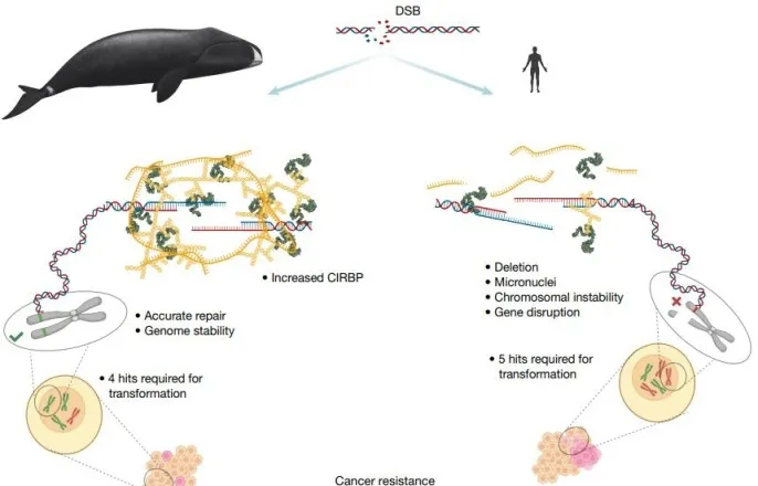 美연구팀"효율적DNA복구로돌연변이축적막아…암예방·장수기여"(서울=연합뉴스)이주영기자=포유류중가장크고오래사는종중하나로최대수명이200년이넘는보우헤드고래(북극고래.Balaenamysticetus)의장수비결은뛰어난DNA손상복구능력에있다는연구결과가나왔다.보우헤드고래와인간의유전체안정성유지전략비교수명이최대200년이넘는보우헤드고래(Balaenamysticetus)는'저온유도RNA결합단백질'(CIRBP)을통해돌연변이원인이되는DNA이중가닥절단(DSB)을높은효율로정밀하게복구하는것으로나타났다.이런뛰어난DNA복구메커니즘이보우헤드고래의매우긴수명과낮은암발생률에핵심역할을하는것으로추정된다.[Nature,JanVijgetal.제공.재판매및DB금지]미국알베르트아인슈타인의대얀페이크교수팀은30일과학저널네이처(Nature)에서보우헤드고래와사람의섬유아세포(fibroblast)를이용한유전자실험과돌연변이유발실험등을통해보우헤드고래가장수할수있는것은정확하고효율적인DNA복구체계덕분이라는결론을얻었다고밝혔다.연구팀은이연구는보우헤드고래가암억제를위해종양억제유전자를추가로획득하기보다DNA복구기능을강화해유전체안정성을유지한다는가설을뒷받침한다며손상된세포를제거하는대신정확히복구하는전략이장수와낮은암발생의비결일가능성이크다고말했다.보우헤드고래는포유류가운데가장크고오래사는종중하나로수명은최대200년이상,체중은8만㎏을넘는경우도흔하다.이처럼크고오래사는동물은세포분열횟수가많아DNA돌연변이발생확률이높아지고그로인한암발생위험도클것으로예상돼왔다.하지만몸집이크지만장수하는보우헤드고래처럼많은세포와세포분열이암과짧은수명으로이어지는것은아니다.이처럼동물의몸크기와암발생률간예상과실제가일치하지않는현상은수십년전부터알려져있었고'피토의역설'(Peto'sparadox)로불린다.연구팀은보우헤드고래가오래살아남기위해서는암과노화관련질환을예방하는매우강력하고독특한유전적메커니즘이있어야한다며지금까지그에대한연구는주로게놈과전사체(transcriptome)분석에그쳤다고지적했다.이들은보우헤드고래와인간의섬유아세포를배양해암세포화에필요한유전변화수를측정하는유전자실험과자외선같은DNA손상·발암자극에노출하는실험등을통해두세포의암세포화가능성을비교조사했다.그결과보우헤드고래세포는인간세포보다악성종양으로변하는데필요한돌연변이수는적었지만실제로돌연변이가발생하는빈도는인간세포보다훨씬낮은것으로나타났다.연구팀은이는보우헤드고래세포가DNA손상에노출될수는있지만손상된DNA가효과적으로복구된다는것을시사한다며보우헤드고래세포의DNA복구과정분석결과이중가닥절단(double-strandbreak)복구속도와정확도가매우높은것으로나타났다고밝혔다.또보우헤드고래세포에서는DNA복구와관련해'저온유도RNA결합단백질'(CIRBP)이높은수준으로발현되는현상도발견됐다.이단백질을인간세포에서과발현시키면DNA복구능력이향상되는것으로확인됐으며,CIRBP가과발현된초파리는수명이연장되고방사선저항성이향상됐다.연구팀은이연구는대부분암이발생하는상피세포(epithelialcells)대신섬유아세포를사용한한계가있지만이결과는우수한DNA복구메커니즘이보우헤드고래의장수에기여한다는가설을뒷받침한다고설명했다.이어보우헤드고래의DNA복구메커니즘을토대로한치료법을개발하면향후DNA손상으로인한유전자불안정성을줄여암이나노화관련질환위험을조절할수있는새로운접근법이될수있다고덧붙였다.◆출처:Nature,JanVijgetal.,'EvidenceforimprovedDNArepairinlong-livedbowheadwhale',https://www.nature.com/articles/[email protected]▶제보는카톡okjeboCopyright©연합뉴스.무단전재-재배포,AI학습및활용금지