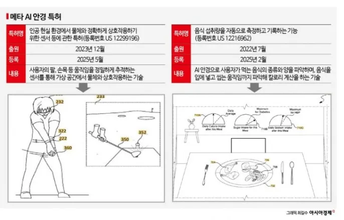 메타,스마트폰이후시대주도권쟁취야심미국특허청에등록된AI안경관련특허보니제약없이가상현실즐기고식습관개선도와메타가인공지능(AI)안경을스포츠·바이오헬스분야로적극확장하면서차세대기술플랫폼에도전하고있다.음성번역,음악재생,전화통화는물론증강현실(AR)·혼합현실(MR)기술을적용하는등스마트폰을능가하는플랫폼으로키우겠다는야심을드러내고있다는평가다.29일AI검색솔루션'키워트'에따르면메타는최근미국특허청에AI안경을착용해가상세계에서골프와야구를즐길수있는기술을특허출원했다.메타는지난달미국시장에AI안경(메타레이밴디스플레이)을출시하고,손목에차는'뉴럴밴드'와함께799달러가격에판매하고있다.지난5월등록된미국특허(US12299196)를보면메타는손목에착용하는웨어러블장치로사용자의손과팔움직임을정밀하게추적하고이를가상현실에반영하는기술을개발하고있다.이기술을적용하면사용자가야구공이나야구배트를손에쥐지않아도가상현실에서야구를즐길수있다.손목에차는뉴럴밴드나스마트워치등웨어러블기기에장착된센서가팔의힘과손목의방향을인식해'커브볼'을던지는것까지파악한다.골프역시골프채나골프공없이도시간과장소에구애받지않고가상현실에서즐길수있게된다.해당특허설명에따르면이동하는물체의속도와방향,가속도등을측정하는'관성측정장치(IMU)'와근육의전기신호를측정하는'신경근신호센서'를활용해사용자의팔,손목,손의움직임을실시간으로정밀하게감지할수있다.팔을빠르게휘두르면강하게타격되고손목을비틀면회전이추가되는방식이다.이런기술을통해사용자가실제공을던지거나스윙한대로가상공간에서구현할수있다.지난달공개된메타의신형인공지능(AI)안경‘메타레이밴디스플레이’와손목에차는뉴럴밴드.메타제공스마트안경으로사용자가먹고있는음식의칼로리를계산해주고음식을씹는정도까지측정해식습관을개선해주는기술도추진하고있다.지난2월미국에특허등록된이기술(US12216962)은스마트안경의AI이미지분석기능에초점을맞췄다.카메라로찍은음식의종류를식별하고,이미지의깊이·크기정보를바탕으로음식의양을추정한다.이를통해칼로리와탄수화물,단백질,지방등을계산해준다.스마트안경화면한쪽에는하루적정섭취칼로리와내가먹은음식의칼로리를그래프로표시해준다.다이어트를하는이들이나식이조절이필요한당뇨병·고혈압환자까지활용가능한기술이다.특히스마트안경이음식을씹는동작까지파악해사용자가충분히씹어삼켰는지도알려준다.메타는웨어러블기술구현을위해다양한분야의기업인수합병에도적극나서고있다.앞서2019년메타는움직임과신경자극을디지털입력신호로변환하는손목밴드를개발하는뉴욕소재스타트업CTRL-랩스를인수했다.CTRL-랩스는신경뉴런활동을측정해사람이행동하지않고생각만하더라도디지털화면에서움직일수있게하는기술을개발해왔다.또메타는AI안경사업을강화하기위해지난7월선글라스브랜드레이밴과오클리의모회사인에실로룩소티카의지분3%를약35억달러(약5조원)에인수했다.메타가최근출시한신형AI안경은고해상도디스플레이가렌즈측면에적용돼전작보다업그레이드됐다.'헤이메타'라고부르면AI비서가활성화돼실시간번역,메시지전송,사진촬영등의기능을수행한다.무게는69g까지줄여장시간착용해도부담없게만들었고한번충전으로최대6시간사용가능하다.내년초에캐나다·프랑스·이탈리아·영국에출시할예정이고,한국출시여부는미정이다.김보경기자[email protected]©아시아경제.무단전재및재배포금지.