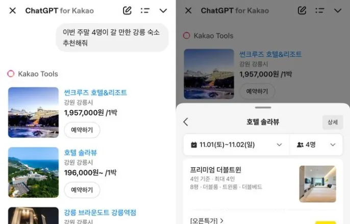 카카오,카카오톡에'챗GPT포카카오'탑재선물하기·예약하기등카카오서비스와연동챗GPT채팅과일반채팅간콘텐츠공유용이장소추천고도화는필요…서드파티확장기대카카오톡내'챗GPT포카카오'활용예시.'이번주말4명이갈만한강릉숙소를추천해줘'라고검색하니숙소목록이나왔다.카카오예약하기를통해즉시예약도가능하다.카카오톡캡처.이번주말고등학교친구들과1박2일강릉여행을가기로했다.숙소를예약할때보통은여러숙박앱을뒤져괜찮다싶은장소를채팅방에공유하곤했다.여러앱을오가는번거로움.카카오톡에'챗GPT포카카오'가도입되며이런번거로움이사라졌다.챗GPT포카카오에'이번주말4명이갈만한강릉숙소추천해줘'라고물으니즉시호텔과리조트를제안해준다.앱이탈없이바로예약도가능했다.대충마무리됐나싶었더니한친구가여행중초당옥수수커피맛집에들르고싶단다.평소였다면귀찮아짜증이났겠지만이제번거로움은챗GPT포카카오의몫이다.즉각강릉내초당옥수수커피맛집리스트를뽑아준다.추천리스트는긁어서복사해붙일필요도없이한번의터치로단톡방에공유된다.카카오가일찌감치예고했던'챗GPT포카카오(ChatGPTforKakao)'의카카오톡탑재가28일드디어이뤄졌다.이용자는카카오톡에서AI(인공지능)서비스'챗GPT'를이용할수있다.두번째채팅탭상단에새로생긴'챗GPT'버튼을누르면된다.이날오전부터앱을최신버전으로업데이트한이용자를대상으로순차적용중이다.카카오톡에들어온챗GPT를사용한첫소감은무엇보다'편리하다'는점이었다.카카오톡을열고상단탭에서눈에띄는챗GPT버튼을클릭하면바로서비스를만날수있다.카카오계정으로도연결되기때문에이전에챗GPT를사용한적없더라도간단하게접근할수있다.다만무료이용자의경우챗GPT와마찬가지로사용한도는존재한다.UI(사용자인터페이스)는챗GPT평소디자인과동일하다.직관적인사용성이특징이다.유료서비스구독임을감안했을때챗GPT포카카오는사용자가원하는정보를빠르고정확하게제공했다.특히챗GPT포카카오는카카오생태계내서비스와의연동이강점으로보였다.카카오는챗GPT포카카오에카카오서비스와연동되는AI에이전트'카카오툴즈'를지원한다.이용자는이서비스에서카카오맵,카카오예약,카카오선물하기,멜론등을함께사용할수있다.단순히대화를나누는AI를넘어다양한카카오서비스간인터페이스역할을해줘사용자편의성이크게높아졌다는느낌이들었다.물론,카카오툴즈기능을끄는것도가능하다.카카오톡내'챗GPT포카카오'활용예시.카카오톡캡처.실제챗GPT포카카오에'판교역근처핫초코파는카페알려줘'라고검색하니카카오맵을호출해카페5곳의위치정보와평점을알려줬다.오른편에있는위치아이콘을누르니카카오맵에서해당카페정보가바로떴다.추천카페를목록을채팅방에곧바로공유하는것도가능하다.다만장소추천기능은고도화가필요해보였다.양꼬치맛집을추천해달라고물었더니양고기맛집을추천해주는식의오류가발생하기도했다.카카오톡내'챗GPT포카카오'활용예시.카카오톡캡처.특히편리하다고느낀부분은카카오선물하기와의연동이다.'3만~5만원사이에서친한언니생일선물추천해줘.언니는집순이라집에서사용할만한용품이면좋겠어'라고물어보니카카오선물하기에서판매하고있는향초,무드등,디퓨저,카페트등을다채롭게추천해줬다.상품을누르면선물하기내상세페이지로연결됐다.챗GPT포카카오는카카오톡의사용성을목적형메신저에서검색을아우르는플랫폼까지확장시키기위한핵심수단이다.실제사용해보니단순히대화를나누는AI로서의기능도수행했으나카카오서비스와의연동성이상당히높아대화를기반으로한일상적인정보검색에유용했다.카카오툴즈가카카오서비스를넘어세컨파티앱으로확장될경우카카오톡의락인효과가한층강력해질것으로보인다.AI서비스강자인챗GPT와국민메신저카카오톡의결합이일상생활을어떻게더효율적으로변화시킬지주목된다.Copyright©데일리안.무단전재및재배포금지.