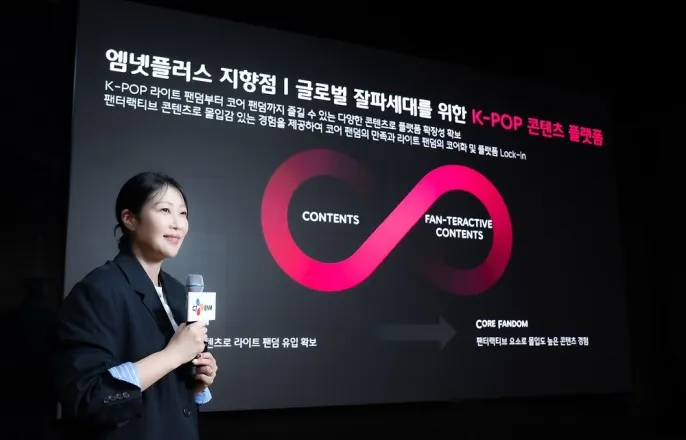 누적가입자4000만·해외비중80%…글로벌잘파세대중심확산CJENM“오리지널4배확대,광고기반무료시청으로접근성강화”28일오전서울상암동CJENM센터에서‘잘파세대파고든엠넷플러스,글로벌플랫폼으로날다’를주제로열린‘컬처TALK’행사에서김지원엠넷플러스사업부장이발표하고있다.ⓒCJENMCJENM이K-POP콘텐츠플랫폼‘엠넷플러스(MnetPlus)’를콘텐츠·팬덤·비즈니스가유기적으로연결되는핵심축으로삼고‘올인원팬터랙티브(Fanteractive)플랫폼’으로도약시키겠다는청사진을28일제시했다.팬터랙티브는팬(Fan)과상호작용(Interactive)을합성한말로'팬이직접참여하고소통하는플랫폼'이라는의미를담고있다.CJENM은이날오전서울상암동CJENM센터에서‘잘파세대파고든엠넷플러스,글로벌플랫폼으로날다’를주제로열린‘컬처TALK’행사에서아티스트출연예능,서바이벌경연프로그램등팬들이즐길수있는다양한오리지널콘텐츠를확보하겠다고밝혔다.엠넷플러스는엠넷방송의오리지널지적재산권(IP)을중심으로한K팝콘텐츠플랫폼으로출발했으며투표앱기능을포함해팬들이직접참여하는커뮤니티요소를강화했다.올해부터는콘텐츠플랫폼으로리포지셔닝해제공콘텐츠를확대했다.대표적으로‘숨바꼭질’,‘TheCityofSpy:NCT127’등오리지널예능을비롯해Mnet의방송IP,콘서트,KCON,MAMAAWARDS등이있다.‘보이즈2플래닛’의경우파이널생방송투표에서초당최고7만표가집계되는등팬덤의뜨거운참여를입증하기도했다.이같은성장세로론칭3년만에누적가입자4000만명을넘어섰고,월간활성이용자(MAU)는2000만명,일간활성이용자(DAU)는762만명을돌파했다.전체트래픽의약80%가해외이용자로구성돼있으며,글로벌잘파세대를중심으로이용층이빠르게확산되고있다.잘파세대는Z세대(GenZ)와알파세대(GenAlpha)를묶어부르는말로2000년대초반~2020년대초반출생세대전체를아우른다.김지원엠넷플러스사업부장은'글로벌K-POP콘텐츠플랫폼엠넷플러스확장전략'주제발표를통해엠넷플러스를'탐색부터몰입까지글로벌잘파팬덤을아우르는케이팝올인원플랫폼'으로성장시키겠다는회사의전략을소개했다.팬덤의절반을점유하는1020세대가직접참여하고몰입할수있는‘경험의플랫폼’으로서의가치를실현하겠다는취지다.이같은전략은과거‘데뷔→마케팅·브랜딩→팬덤형성’으로이어지던20세기K-POP모델이,21세기들어‘팬덤→마케팅·브랜딩→데뷔’순의‘팬덤중심생태계’로재편되면서가능해졌다.예를들어데뷔오디션프로그램은팀이나멤버가확정되지않은상태에서시청자가자신이좋아하는후보생을정해지지한다.데뷔전부터팬덤이형성된후보생은팬서포트와브랜드와협력을통마케팅효과를얻으며정식아티스트로데뷔하게된다.팬은단순시청에서프로그램참여와아티스트소속감으로관계가확장되며,엠넷플러스에락인(lock-in)되는선순환이이뤄진다.한마디로라이트팬덤이팬투표,팬서포트,디지털포토카드등다양한팬터랙티브체험을하며코어팬덤으로전환되는구조다.차우진엔터문화연구소대표(왼쪽부터)와김지원엠넷플러스사업부장ⓒCJENM팬덤생태계의위력을확인한엠넷플러스는▲K-POP을기반으로한다양한오리지널콘텐츠확대▲글로벌스트리밍서비스고도화▲팬덤밸류체인강화를중심으로플랫폼경쟁력제고에나설예정이다.김사업부장은"내년에는오리지널콘텐츠투자를약4배로증가시킬것"이라며"이러한투자를통해더많은양질의오리지널콘텐츠로전세계고객들을만날예정"이라고밝혔다.또광고기반무료시청모델을통해누구나부담없이이용할수있는환경을조성하고,프리미엄콘텐츠등선택의폭과팬경험의깊이를확장해팬·아티스트·브랜드를연결하는선순환구조를구축하겠다는계획이다.김사업부장은"엠넷플러스는트래픽기반의광고수익을기본으로한다.영상콘텐츠앞에사전광고를삽입하는형태를취하고있다"면서도"그외에이미지디스플레이광고,리워드광고등을진행하고있으며특별한영역으로브랜드협찬기반팬트랙티브요소를만들어내는것도새로운광고모델"이라고설명했다.그러면서"유료콘텐츠를무리하게추진하기보다는트래픽기반수익모델로나아가도록하겠다"고덧붙였다.더많은고객유입을위해진입장벽을낮추겠다는의미로풀이된다.오리지널콘텐츠계획에대해서는내년에고퀄리티IP를포함해다양한IP를확보하겠다고밝혔다.김사업부장은"올해10월까지5개오리지널타이틀,50여편의콘텐츠가제작됐다"면서"올해가오리지널콘텐츠의원년이었다면내년에는더많은투자를할것"이라고말했다.이같은엠넷플러스의플랫폼전략은결국라이트팬을코어팬으로끌어들이기위한것아니냐는의문도제기된다.이에대해김사업부장은"라이트팬덤도쉽게즐길콘텐츠를제작하고그들이라이트팬덤으로남거나또는코어팬덤이돼전체적인팬덤저변을넓혀가는것이엠넷플러스의가장큰축"이라며"더욱깊이있게사랑하는고객들이늘어나는현상을만들겠다는의미로이해해달라"고말했다.내년엠넷플러스는한국에서더나아가북미,유럽,오세아니아등다양한지역도공략할예정이다.해외진출전략에대해김사업부장은"엠넷플러스오리지널콘텐츠에출연하는아티스트들은메가아티스트"라며"다양한콘텐츠와출연아티스트