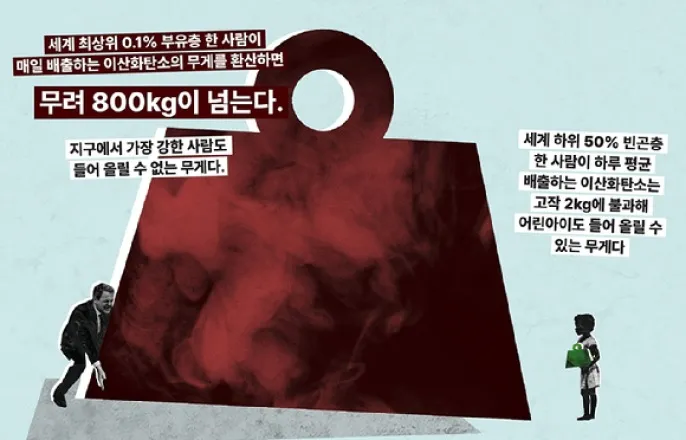 최상위1%vs하위50%하루탄소배출량=800kgvs2kg영국의구호단체옥스팜이‘기후위기:불평등이불러온세계의재난’을발표했다.[사진=옥스팜][아이뉴스24정종오기자]질문:기후위기시대를두고이번세기말이끝날때까지‘1.5도상승제한’은달성하지못할것이란지적이많다.탄소배출량이줄지않기때문이다.부유층과기득권은‘기후위기는사기’‘기후위기는자연적현상’등으로현실을왜곡시키고있다.기후위기는‘불평등의극치’를보여준다고하는데진짜그런가?답:최근영국의구호단체인옥스팜에서관련보고서가나왔다.탄소배출량을분석해봤더니최상위부유층1%는하루에800kg을배출하는데하위50%는2kg에불과했다.여기에부유층은화석연료업체등에투자해막대한이익을챙기고있었다.온실가스증가로지구평균기온이오르고대형재난으로이어진다.그영향은고스란히빈민국,하위층이받고있다.기후위기는‘불평등의적나라함’을보여주고있다.도널드트럼프미국대통령의‘기후위기는사기극’이란말에서권력층이얼마나기후위기상황을안이하게판다하고있는지를알수있다.미국에대형산불이나홍수가발생해도‘기후위기’와전혀상관없다는입장을고수하고있다.여기에트럼프는‘Drill,baby,Drill!’이란말로화석연료를더파고채굴하자는의지도내비쳤다.그에게온실가스배출은중요치않고이익만챙기는부유층의적나라함을보여주기에충분하다.영국의구호단체옥스팜이최근‘기후위기:불평등이불러온세계의재난’을발표했다.2024년8월방글라데시를강타한홍수로마을이침수됐다.[사진=옥스팜]세계최상위0.1%부유층이하루동안배출하는탄소오염량이하위50%가1년동안배출하는양보다훨씬많은것으로나타났다.어느정도격차는예상했는데‘800kgvs2kg’으로그차이는엄청났다.부유층들이권력과부를통해탄소를맘껏배출하는사이하위50%는그영향으로기후재난은물론심각한생명의위협까지받는모습을보여주고있다.모든사람이초부유층과같은수준으로배출한다면탄소예산(지구온도상승을1.5도이내로억제하기위해배출할수있는이산화탄소의남은양)은3개월도채되지않아소진될것이란분석이나왔다.국제구호개발기구옥스팜(Oxfam)은다음달10일브라질벨렝에서열리는제30차유엔기후변화협약당사국총회(COP30)에맞춰29일발표한‘기후위기:불평등이불러온세계의재난’보고서를통해이같이설명했다.관련보고서내용을보면세계최상위0.1%부유층한사람이매일배출하는이산화탄소는800kg이넘었다.지구에서가장강한사람도들어올릴수없는무게다.반면,세계하위50%한사람이하루평균배출하는이산화탄소는고작2kg에불과하며이는어린아이도들어올릴수있는무게다.초부유층은단순히탄소를과소비하는데그치지않고가장오염배출이심한기업들에적극적으로투자하며이익을얻고있다.옥스팜연구를보면억만장자한명이투자로인해연간평균190만톤의이산화탄소환산량(CO2e)을배출한다.이는억만장자들이개인전용기로지구를거의1만바퀴돌아야나오는배출량과맞먹는다.억만장자들의투자중거의60%가석유나광업과같은기후영향이큰분야로분류되며이는S&P글로벌1200지수에평균적으로투자하는것보다2.5배더많은배출량을발생시킨다.억만장자308명의투자포트폴리오배출량만으로도118개국의총배출량을합친것보다많다.아미타브베하르(AmitabhBehar)옥스팜인터내셔널총재는“기후위기는불평등의위기”라며“세계에서가장부유한사람들은기후파괴에자금을대고그로부터이익을얻는반면그들의무제한적권력이초래한치명적결과를전세계대다수가고스란히감당하고있다”고지적했다.초부유층개인과기업의막대한권력,부는정책결정에부당한영향력을행사하고기후협상을희석시키는데에도관여하고있다.지난해COP29에서1773명의석탄,석유,가스분야로비스트가참석을승인받았는데이는기후취약국상위10개국을합친수보다많다.도널드트럼프대통령은'기후위기는사기극'이란주장을굽히지않고있다.전세계권력층의기후위기인식을엿볼수있는대목이다.[사진=연합뉴스]미국,영국,프랑스,독일을포함한여러부유하고배출량이많은국가는반기후로비스트들의거액기부를받아기후관련법률을약화시켰다.아미타브베하르총재는“권력과부가소수에게집중되도록방치된것은참담한일”이라며“그들은이를이용해영향력을더욱공고히하고우리모두를지구파괴의길로몰아넣고있다”고직격했다.이어“우리는초부유층의극단적부에세금을부과하고그들의로비활동을금지함으로써기후정책에대한그들의지배력을무너뜨려야한다”며“대신기후위기로가장큰피해를당한이들을의사결정과정의최전선에세워야한다”고강조했다.최상위1%의부유층이배출하는온실가스는세기말까지약130만명의폭염관련사망자를발생시킬만큼심각하며,2050년까지저소득과중하위소득국가에44조달러의경제적손실을초래할것으로예상된다.옥스팜측은“기후협상에서시민사회와원주민집단의참여를강화하고기후변화의불평등한영향을해결해야한다”며“역사적책임과행동역량을반영한국가온실가스감축목표(NDC)를이행하고선진국이기후재정을제공하도록보장함으로써잔여기후예산에대한공정한분담방식을채택해야한다”고덧붙였다.