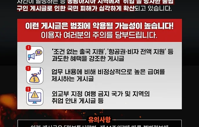 커뮤니티활성화한카페서비스이용자대상으로유의당부[아이뉴스24정유림기자]최근캄보디아를포함한동남아시아지역에서한국인을대상으로한불법구인광고에대한우려가제기된가운데,인터넷기업네이버와카카오가정부의협조요청에발맞춰이용자에주의를당부했다.취업빙자불법구인게시글관련주의안내[사진=방송미디어통신위원회]31일네이버에따르면회사는최근카페서비스이용자를대상으로이같은내용을알렸다.네이버측은"최근캄보디아에서발생한사건과관련해방송미디어통신위원회(방미통위)의협조요청에따라안내하는내용을서비스이용시참고하길바란다"며"불법구인게시글관련한피해가생기지않도록이용자의주의를당부드린다"고했다.카카오도다음카페서비스이용자에게이러한내용을알리면서해외구인관련게시글이용시각별히유의할것을당부했고안전한서비스이용환경을조성하기위해노력하겠다고덧붙였다.함께게재된정부의알림글에는"최근동남아시아지역에서취업을빙자한불법구인게시글로인한국민피해가심각하게확산하고있다"며"이들게시글은고수익일자리를미끼로청년층등을캄보디아등의동남아시아지역으로유인한뒤주식리딩방운영,보이스피싱등불법행위에가담시키고해외범죄조직에도악용되는등국민의생명과안전을위협하고있다"고했다.그러면서"조건없는출국지원,항공권·비자전액지원,숙소무료제공등과도한혜택을강조하거나업무내용에비해비정상적으로높은급여를제시또는외교부지정여행금지국가나지역의취업안내게시글등은범죄에악용될가능성이매우높으므로현혹되지않도록정보통신서비스(SNS,포털,각종게시판등)이용자의각별한주의가필요하다"고강조했다.또"범죄를목적으로하거나불법행위를조장하는이와같은게시글은정보통신망법제44조의7에따른불법정보에해당할수있으며온라인상게시가금지되고형사처벌대상이될수있음을유념해달라"고덧붙였다.앞서방송미디어통신위원회는캄보디아한국인사망사건과관련해동남아시아지역에서취업을미끼로불법구인광고를벌이는문제에대응하기위해경찰청등관계기관실무태스크포스(TF)를구성하고범죄유인의심게시글에대한집중모니터링등을논의했다.정부는정상적인구인광고로가장한게시물의불법성을입증하기어려운현실을고려해범죄연루게시글의정형화된패턴을포착하고관련게시글에대한포털과사회관계망(SNS)사업자의자율규제강화를요청했다.연장선상에서국내양대인터넷기업인네이버와카카오도혹시모를추가피해등을막기위해조치한것으로풀이된다./정유림기자([email protected])Copyright©아이뉴스24.무단전재및재배포금지.