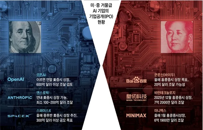 AI기업들,양국증시에따로상장지난해12월12일중국의배터리소재기업론디안왓슨은중국증권감독관리위원회(CSRC)로부터미국증시에기업공개(IPO)를해도된다는허가를받았다.중국관영중화망은“CSRC는지난해4월부터자국기업의해외상장을단한건도승인해주지않았는데,8개월만에론디안왓슨이‘얼음을깨고’승인을받았다”고전했다.하지만중국산업계에선“CSRC가철저한기술검토를거쳐론디안왓슨이인공지능(AI)·데이터센터등차세대핵심기술과관련이없다는점을확인하고승인을해준것”이라면서“중국대형AI기업의미국상장길은사실상끊겼다”는얘기가나왔다.그래픽=박상훈미·중의자본시장‘디커플링(탈동조화·decoupling)’이심화하며,양국의AI패권전쟁이최첨단AI기술개발다툼을넘어자본시장전체로확산하고있다.AI기술경쟁은인프라구축등을위한막대한자본의뒷받침없이는패할수밖에없다.미·중은2010~2020년대초반만해도중국스타트업이미국증시에서대규모IPO를하며자금조달을하고,상장을주관하는미국투자은행들이수익을얻는윈·윈구조였다.하지만최근수년간미·중당국이기술·자본교류를틀어막으면서양국의기술기업과자본시장은각자도생하는블록화로완전히갈라지게된것이다.홍콩사우스차이나모닝포스트(SCMP)는“올해양국에서초대어급AI기업이잇따라상장을하게되면서,주식시장은글로벌자본이미국과중국중어느AI생태계에더투자할의향이있는지를보여주는지표가될것”이라고했다.◇대형AI상장잇따르는2026년미국에서는오픈AI·앤스로픽·스페이스X가이르면올해상장이예고됐다.스페이스X는2019년사우디아람코가세운세계최대규모IPO(294억달러)를넘어선300억달러이상자금조달이예상되고,오픈AI는이를넘어선600억달러(약84조원)규모의공모를노리고있다.이같은초대형IPO는세계최대인미국자본시장패권을확실히보여주는동시에,AI기술패권에서도중국을따돌렸다는점을과시하는이벤트가될전망이다.그래픽=박상훈중국은규모면에서당장미국과비교하기어렵지만,착실하게자체증시규모와매력을높여가고있다.과거같으면미국행을선택했을AI스타기업의해외상장을막고,규제완화를통해자국증시상장을유도하고있다.SCMP에따르면알리바바와바이두는각각반도체사업부를떼어내홍콩증시에상장한다는계획이다.‘중국판엔비디아’를꿈꾸는알리바바의티헤드와바이두의쿤룬신이상장하면앞서중국·홍콩증시에상장한무어스레드·비런·메타X와함께중국독립AI반도체빅리그가형성되며투자매력도가높아질것이라는분석이나온다.◇미·중자본시장경쟁본격화중국은세계최대자본시장미국과경쟁하기위해외국기관투자가가중국본토A주·채권·파생상품에투자할때필요한인가·등록절차를대폭간소화했다.그러면서중국판나스닥인커촹반에AI기업등테크기업의적자상장을재개시켰다.홍콩증시역시2024년부터적자테크기업의상장문턱을계속해서낮추고있다.성장성이큰자국AI기업상장을부추기면서,외국투자유치에적극적으로나선것이다.홍콩증시는지난해에만110곳이넘는신규상장으로365억달러를조달해2025년세계1위IPO시장(자금조달액기준)에등극했다.AI전문가들은자체투자유치와비교가안되는대규모자금을한번에조달할수있는만큼,성공적인IPO는AI기업의지속적인기술개발에필수조건이라고보고있다.그만큼미·중의자본시장다툼은단순한AI기업시총싸움을넘어글로벌AI패권을다시그리는작업에가깝다는평가다.미국과중국중에서어느쪽이더매력적인자본시장을제시하는지에따라소속AI기업의성장은물론장기적으로국가안보의운명까지바꾸게된다는것이다.AI업계관계자는“앞으로5~10년미·중자본시장은점점더분리되면서글로벌기업과투자자들은어느쪽체제에더깊게얽힐지전략적선택을강요받는시대가될것”이라고했다.Copyright©조선일보.무단전재및재배포금지.