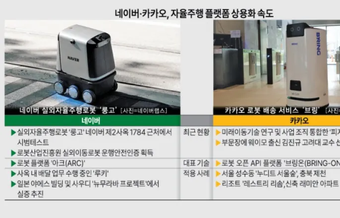카모,이번주'피지컬AI'부문가동…연구개발과사업조직통합네이버,실외자율주행시범테스트…'루키2'일본·사우디등진출[사진=아주경제그래픽팀]글로벌피지컬인공지능(AI)경쟁이시작됐다.테슬라·현대자동차등제조기업을중심으로휴머노이드로봇을1~2년내에상용화해제조공정에투입한다고밝힌가운데,엔비디아는벤츠와손잡고올해1분기자율주행차를선보인다.글로벌빅테크기업들은로봇구동을위한소프트웨어와플랫폼개발에집중하고있다.최근마이크로소프트(MS)가촉각을느끼고양손조작이가능한로보틱스모델'로-알파'를공개했다.국내역시네이버와카카오가외부배달·청소·컨시어지등을수행하는자율주행로봇플랫폼과소프트웨어개발에박차를가하고있다.26일업계에따르면카카오는이번주부터자율주행·로봇등미래이동기술연구조직과사업조직을통합·신설한'피지컬AI'부문을가동한다.연구개발을넘어물리적환경에서실제작동할수있도록기술상용화에집중하겠다는것이다.부문장으로신규영입한김진규고려대컴퓨터학과교수는이번주출근한다.김부문장은웨이모등글로벌기업에서실무경험과학계전문성을두루갖춘산학통합형전문가로,자율주행및피지컬AI분야경쟁력확보에힘쓸예정이다.카카오는로봇플랫폼과자율주행상용화에힘쓰고있다.로봇배송서비스'브링(BRING)'과자체로봇오픈앱프로그래밍인터페이스(API)플랫폼브링온(BRING-ON)이대표적이다.브링온은입력된요청사항들을최적의효율과동선으로수행하도록설계됐다.여기에는카카오모빌리티가그동안축적해온AI기반의최적배차·수요예측·라우팅등모빌리티기술노하우가집약적으로적용됐다.다양한기종의로봇과연동가능한것도큰강점이다.LG전자,베어로보틱스,로보티즈,브이디컴퍼니등로봇제조사와협력해로봇서비스를출시했다.브링온이탑재된LG전자배송로봇인'LG클로이서브봇'이대표적이다.이로봇은대형오피스,호텔,아파트병원등다양한장소에서자율주행배송이가능하다.또한삼성물산,호반건설등과파트너십을통해로봇서비스를고려하지않고설계된공간에서도로봇을투입할수있다.이를통해서울성수동복합문화공간'누디트서울숲'을비롯해충북체전리조트'레스트리리솜',신축래미안아파트2개단지에브링온이탑재된로봇을투입하는시범사업을추진한다.네이버도최근실외자율주행을위한연구개발에집중하고있다.네이버랩스가개발한실외자율주행로봇'룽고(Lungo)'가지난해말부터네이버제2사옥인1784근처에서시범테스트를진행중이다.앞서룽고는로봇산업진흥원의실외이동로봇운행안전인증을획득했다.로봇이보행자와함께보도통행을하려면이인증을획득해야한다.향후룽고는네이버지도를기반으로음식및택배배달등외부배송서비스와연계할계획이다.사옥내에서배달업무를수행중인루키처럼올해말까지임직원대상으로서비스를제공하는것이목표다.네이버기술의강점도하드웨어성능에관계없이로봇이일관되게작동할수있다는것에있다.자체개발한로봇플랫폼'아크(ARC)'시스템덕분이다.아크는△클라우드기반로봇제어·관리·모니터링'아크브레인(ARCbrain)'△로봇이위치·경로를인식하게하는'아크아이(ARCeye)'△웹기반운영체제(OS)'아크마인드(ARCmind)'로구성된다.이를통해로봇이5세대(5G)네트워크와클라우드가실시간으로연동돼배송등다양한업무를수행할수있고,이과정에서획득한데이터를수집해학습까지가능하다.네이버는자율주행로봇시스템으로해외진출을꾀한다.지난해NTT동일본,미쓰이부동산과협약을맺고일본도쿄야에스빌딩에아크시스템과로봇딜리버리서비스를테스트했다.또사우디아라비아가추진중인'뉴무라바프로젝트'에서아크시스템실증을추진한다.지난해11월열린단(DAN)25에서는글로벌시장에최적화한루키2를선보였다.현재제2사옥에서실제업무를수행중인루키1과비교해,한국어·일본어·영어등다국어를지원한다는점이특징이다.또한AI기술을적용해5G네트워크가아닌환경에서도동작가능하다.