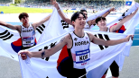 [앵커]트랙위에선우리선수들이태극기를펼친채활짝웃고있습니다.남의잔치로만여겼던육상에서우리나라가가장먼저결승선을통과했습니다.혼자가아니라4명이서만든금메달이라4배더값진데요.유니버시아드대회에서나온남자400m금빛릴레이,홍지용기자입니다.[기자][육상남자400m계주결승/2025라인-루르유니버시아드(독일보훔)]첫번째주자서민준이코너를돌면서앞으로성큼성큼나옵니다.그다음두번째주자나마디조엘진은직선주로에서선두로쭉쭉치고나갑니다.세번째주자이재성이1위를지켜내며코너를돌아나오니,마지막주자김정윤이바통을받아가속을붙입니다.경쟁자들과격차를벌려결승선을여유있게들어옵니다.유니버시아드400m계주에서나온역사상첫금메달이었습니다.무엇보다38초50으로기록도좋았습니다.두달전에세웠던한국신기록에0.01초모자랐습니다.이팀은1년전부터호흡을맞추기시작했고,하나씩단계를밟으며성장해왔습니다.100m개인기록은10초초중반대,그러나넷이함께할때계주기록은점점빨라졌습니다.서로잘하는것을특화한덕분입니다.스타트가좋고,곡선주로에서뛰어난서민준이1번주자를맡았습니다.200m에도강점이있어최대속력으로오래버틸수있는나마디조엘진,코너에서도좋은기록을지닌이재성이뒤를받쳤습니다.마지막주자인앵커로는직선주로에서잠재력이뛰어난선수들을번갈아기용하며경쟁력을높였습니다.그결과1년사이계주기록을0.19초앞당겼습니다.앞으로는내부경쟁에속도를낼계획입니다.이시몬,고승환,비웨사와같은선수들이계주에합류할가능성이열려있습니다.이들의꿈은가깝게는내년나고야아시안게임메달도전,멀게는3년뒤열리는LA올림픽출전입니다.올림픽출전권을얻으려면지금보다계주기록을0.2초이상더단축시켜야합니다.[화면출처STN][영상편집임인수]