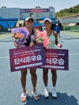 NH농협은행선후배이은혜(왼쪽)와백다연.NH농협은행한국여자테니스간판백다연(315위·NH농협은행)이국제대회2관왕에올랐다.백다연은1일대구유니버시아드코트에서열린국제테니스연맹(ITF)대구국제여자대회(총상금1만5000달러)단식결승에서이은혜(362위·NH농협은행)를눌렀다.백다연은중앙여고2년선배를상대로1세트게임스코어5대6으로뒤진상황에서기권승을거뒀다.전날복식까지대회2관왕을달성했다.백다연은이은혜와복식결승에서김다빈(강원도청)-구연우(성남시청)를세트스코어2대0(6-16-1)으로눌렀다.남지성(804위·당진시청)은함께진행된ITF대구국제남자대회(총상금1만5000달러)단식우승을차지했다.결승에서박의성(777위·대구시청)을세트스코어2대0(6-16-2)완승을거뒀다.박의성은전날복식에서도준우승을거둿다.박의성은권순우(국군체육부대)와호흡을맞춰결승에나섰지만구스하라유스케-나카가와순스케(이상일본)에세트스코어0대2(3-64-6)로졌다.