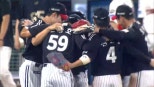 [앵커]LG가8회에만여덟점을뽑아내며KIA에게'스윕승'을거뒀습니다.이로써4연승을거둔LG는선두한화추격에고삐를당겼습니다.조한대기자입니다.[기자]프로야구역대두번째2600이닝을소화한KIA양현종과LG손주영의투수전양상으로흐르던경기.기회는8회초LG에게찾아왔습니다.무사만루의기회,문성주는바뀐투수이준영의초구를받아쳐2타점적시타를뽑아냈습니다.여기에후속타자LG김현수가통쾌한'스리런포'까지터트렸습니다.분위기를탄LG.대타박관우,오지환이연달아1타점씩을신고하더니,박해민의희생플라이까지더해8회초에만무려여덟점을뽑아냈습니다.리그2위LG는KIA의추격의지마저꺾어버린빅이닝을만들며8-0승리를신고,스윕승을거두며'4연승'을달렸습니다.<문성주/LG트윈스선수>"(앞선타자들이)득점권찬스를만들어주면서제가어떻게든편하게치라고생각하고,만들어줬다고생각해가지고좀마음편하게…"1회초고승민의선제솔로포를앞세워리드를잡은롯데.잠잠했던타선은5회초불붙었습니다.5회황성빈의적시타를시작으로,키움선발정현우의보크로한점을추가했습니다.이어'1회솔로포의주인공'고승민이적시타까지터트려한이닝에석점을뽑아냈습니다.최종스코어4-0으로승리를거둔롯데는키움전을위닝시리즈로장식하며리그3위자리를굳게지켰습니다.롯데선발감보아는7이닝동안안타1개만을내주고삼진9개를잡아내는무실점위력투를선보였습니다.대구에서는SSG가1-1상황에서7회초안상현의결승포에이어9회고명준의쐐기포를더해삼성을꺾고6연패에서벗어났습니다.한편이날경기로이번시즌KBO리그는역대최소경기800만관중을달성했습니다.연합뉴스TV조한대입니다.[영상편집김찬][그래픽서영채]#프로야구#LG#문성주#김현수연합뉴스TV기사문의및제보:카톡/라인jebo23